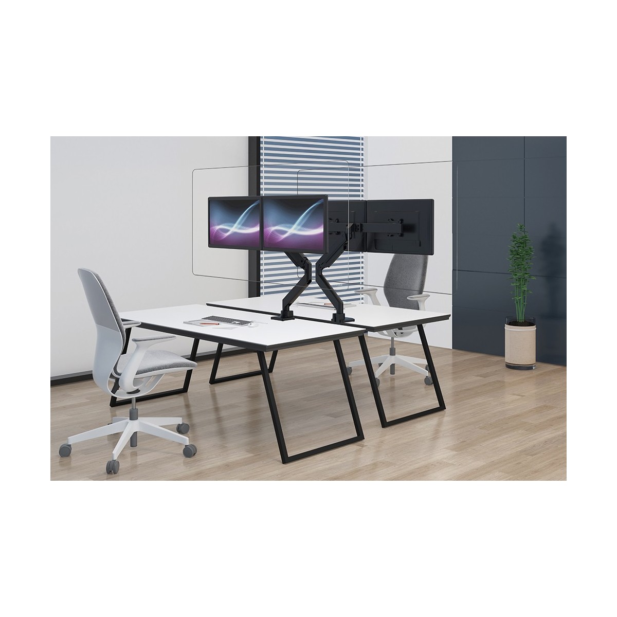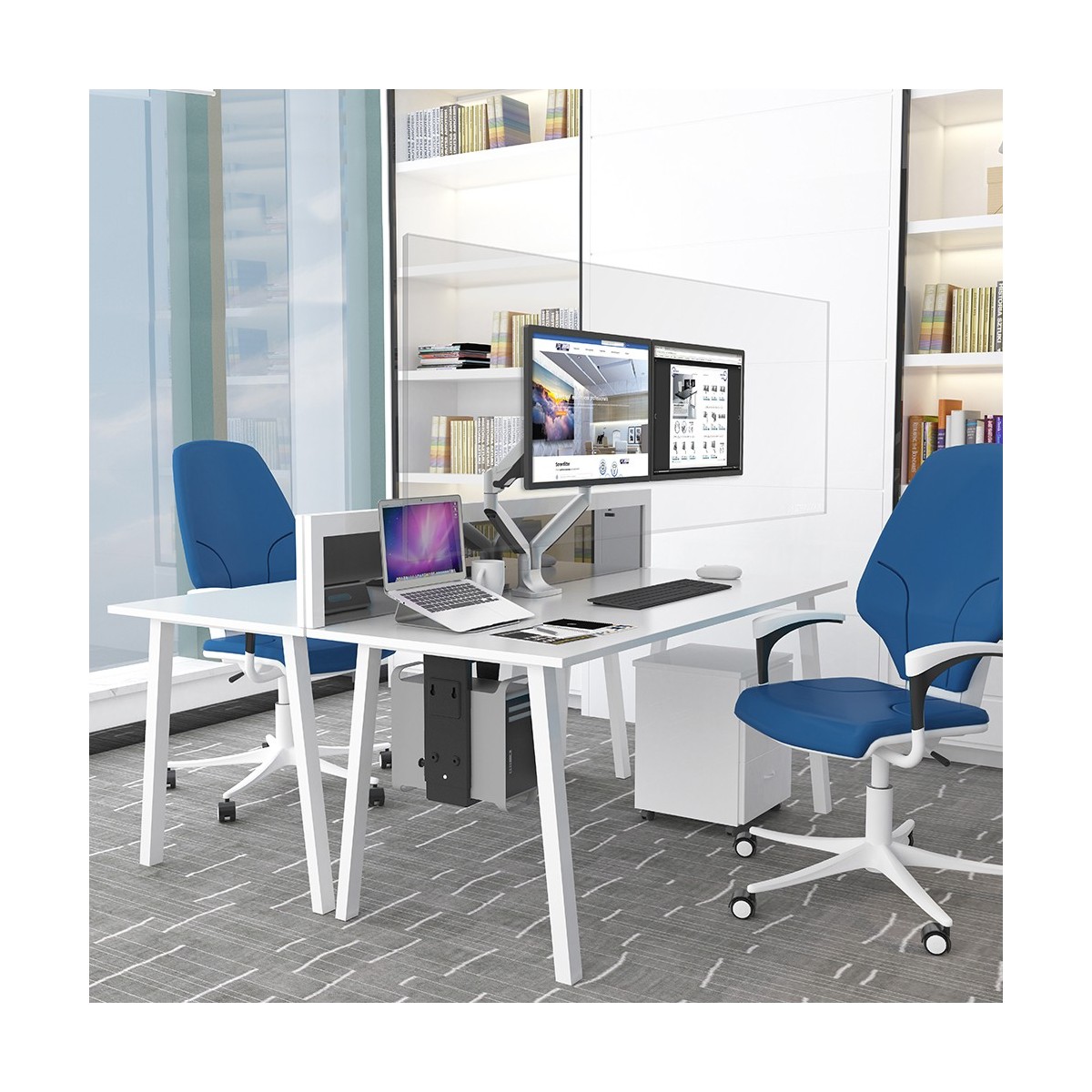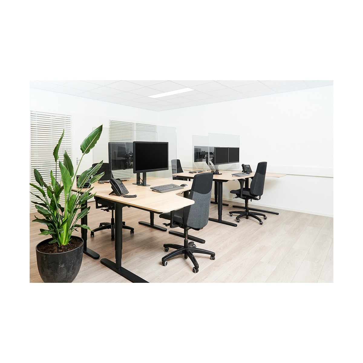 NS-PLXPROTECT2 ha una larghezza di 140 cm x un'altezza di 74 cm e presenta delle fessure per il montaggio di 2 schermi piatti da 22" a 27", entrambi con foro per uno schema di fori VESA di 100x100 mm. Lo schermo è realizzato in acrilico trasparente al 100% per garantire una sensazione di spaziosità e con angoli arrotondati. Lo schermo è dotato di 2 punti di montaggio, in modo che sia regolabile in altezza rispetto ai monitor. Poiché NS-PLXPROTECT2 è montato tra gli schermi piatti e il supporto da tavolo, lo schermo si sposta con i monitor. Gli schermi piatti possono anche essere regolati orizzontalmente l'uno verso l'altro per una regolazione ottimale. NS-PLXPROTECT2 può essere montato su 2 bracci separati, bracci con molla a gas, una traversa e/ o un doppio braccio monitor.