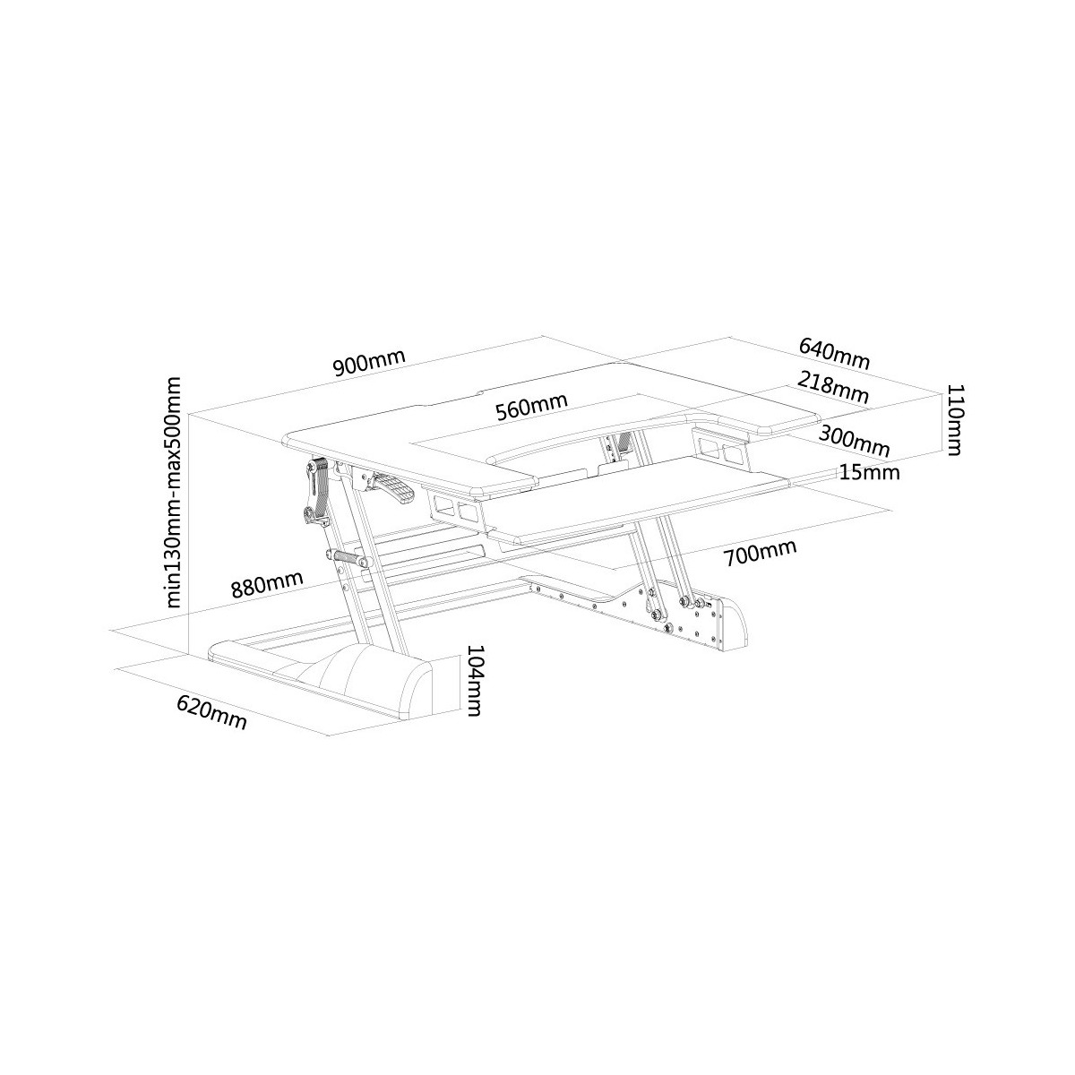 - Piano di lavoro di grandi dimensioni (90 x 64 cm) può ospitare due monitor o un monitor e un computer portatile.