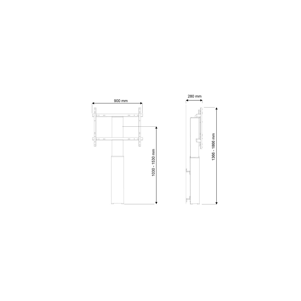 Il carrello mobile a pavimento è regolabile automaticamente fino a un’altezza di 50 cm con telecomando. Dal piano al centro la distanza dello schermo è variabile da 105 a 155 cm. La posizione può essere perfettamente livellata con quattro piedi regolabili sotto la colonna centrale.