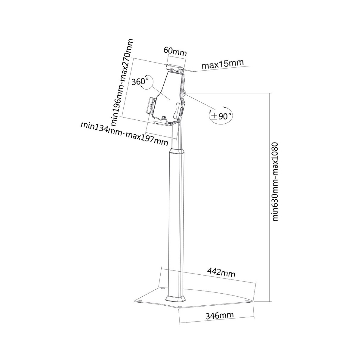 Newstar supporto da pavimento per la maggior parte dei tablet iPad 7.9"-10.5". Peso massimo (capacità): 1 kg, Capienza minima dimensioni dello schermo: 20,3 cm (8"), Capienza massima dimensioni dello schermo: 25,4 cm (10"). Range di regolazione altezza: 630 - 1080 mm, Inclinazione: -90 - 90°. Colore del prodotto: Argento