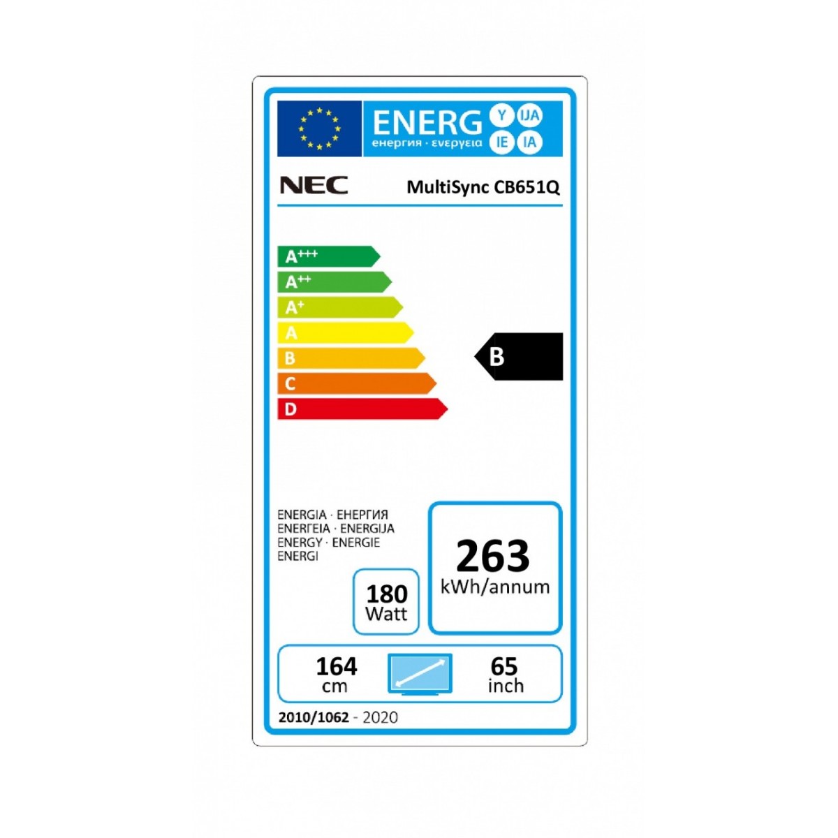 NEC MultiSync CB651Q. Dimensioni schermo: 165,1 cm (65"), Tipo di display: LED, Risoluzione del display: 3840 x 2160 Pixel. Velocità trasferimento Ethernet LAN: 10,100 Mbit/s. Potenza in uscita (RMS): 24 W. Design: Pannello piatto interattivo, Colore del prodotto: Nero, Posizionamento supportato: Interno. Utilizzo: Universale, Ore di servizio (ore/giorni): 12/7