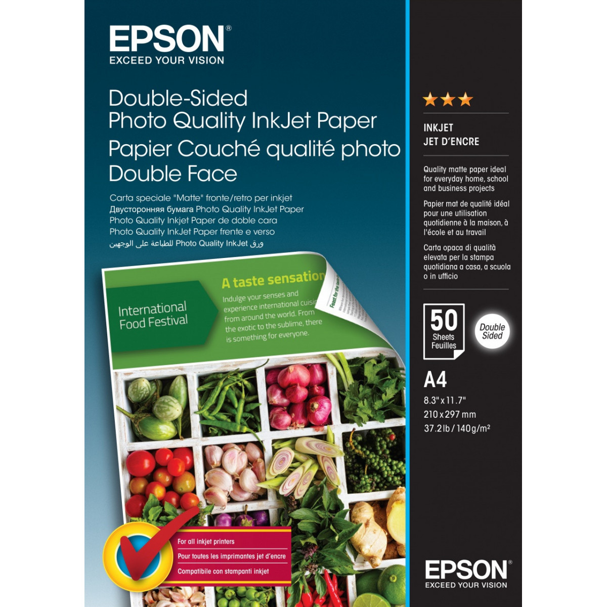 Epson Double-Sided Photo Quality Inkjet Paper - A4 - 50 Sheets. Utilizzo raccomandato: Stampa inkjet, Dimensioni foglio: A4 (210x297 mm), Tipo rifinitura: Opaco. Larghezza imballo: 222 mm, Profondità imballo: 306 mm, Altezza imballo: 15 mm. Quantità per cartone principale: 20 pezzo(i), Ordine minimo: 20 pezzo(i). Paese di origine: Giappone, Prodotti compatibili: WorkForce WF-7620DTWF WorkForce WF-7610DWF WorkForce WF-7110DTW WorkForce WF-3640DTWF WorkForce..., Quantità per pacco: 1 pezzo(i)