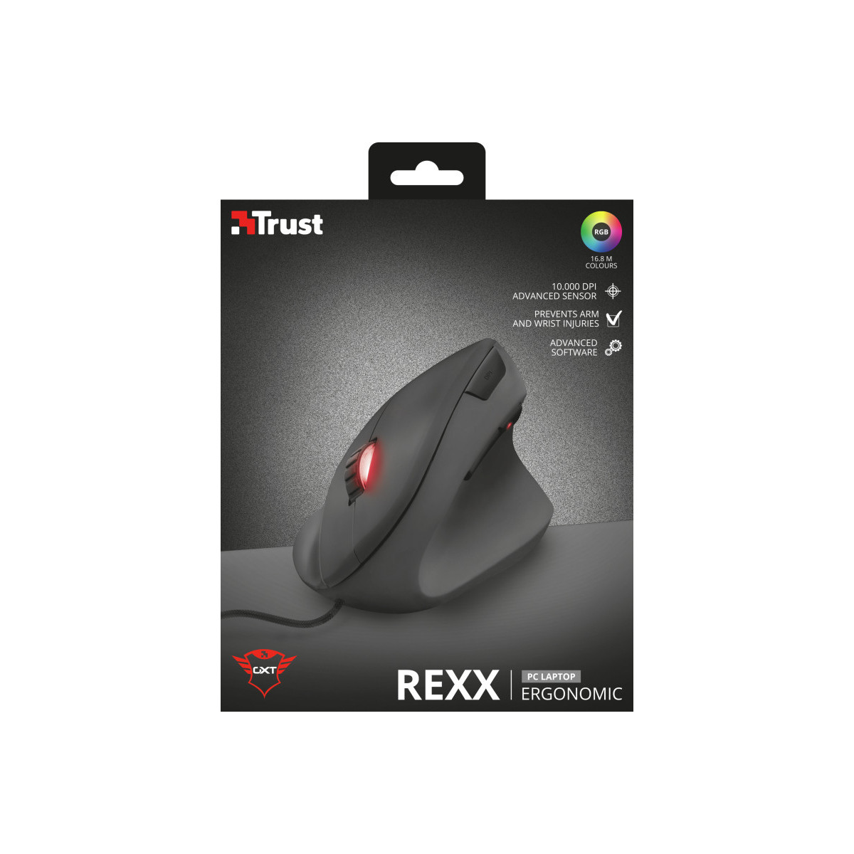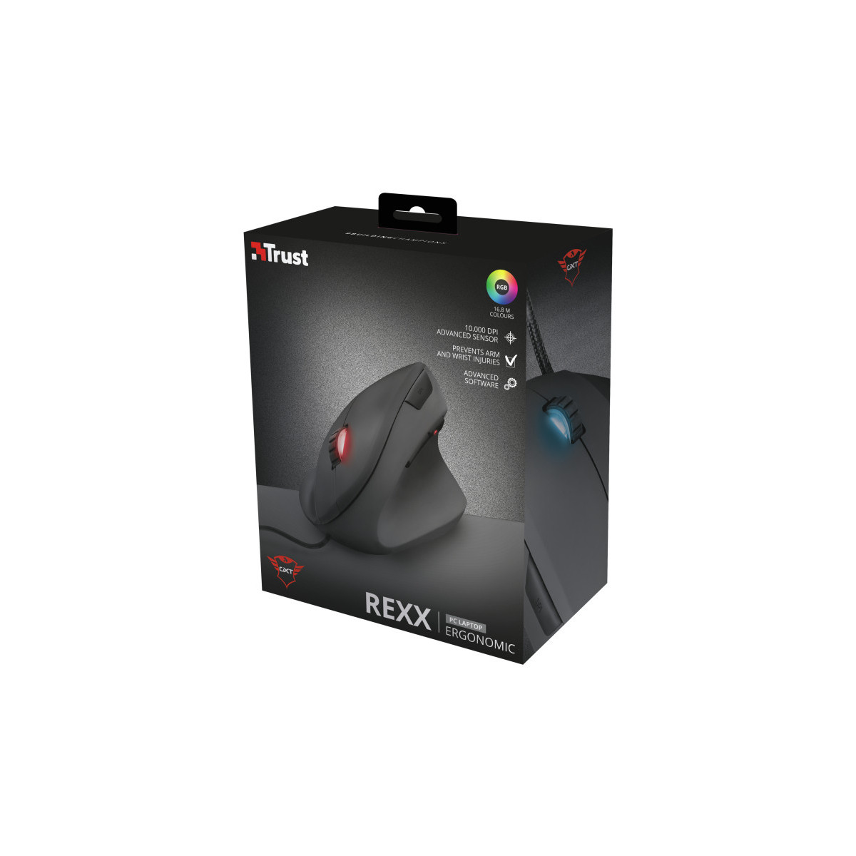 Trust GXT 144 Rexx. Fattore di forma: Mano destra, Design verticale. Tecnologia di rilevamento del movimento: Ottico, Interfaccia dispositivo: USB tipo A, Risoluzione movimento: 10000 DPI, Tipo di pulsanti: Tasti premuti, Numero di tasti: 6, Tipo di scorimmento: Rotella, Accelerazione (max): 20 G. Alimentazione: Cavo. Colore del prodotto: Nero