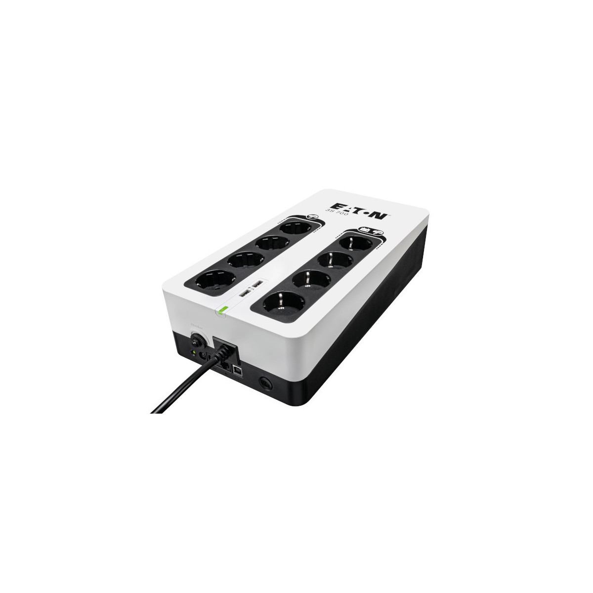 Eaton 3S700D. Topologia UPS: Standby (Offline), Potenza in uscita: 700 VA, Potenza in uscita: 420 W. Quantità prese AC: 8 presa(e) AC. Tecnologia batteria: Acido piombo (VRLA). Colore del prodotto: Nero, Bianco, Lunghezza cavo: 1,5 m, Sicurezza: IEC 62040-1; IEC 62040-2 C2; IEC 62040-3; IEC 62040-4; IEC 61643-11. Larghezza: 335 mm, Profondità: 170 mm, Altezza: 86 mm