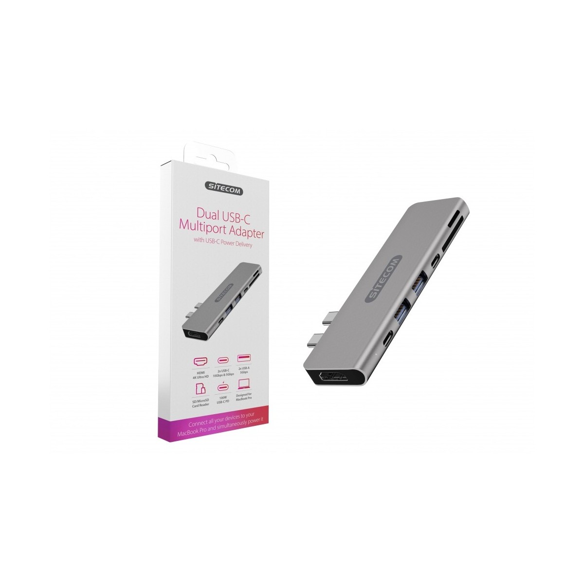 Questo Dual USB-C Multiport Adapter, appositamente progettato per Macbook Pro (2016/2017/2018/2019), trasforma le 2 porte USB-C sul Macbook Pro in 5 porte multifunzionali e 2 slot per lettore di schede e, al tempo stesso, gli fornisce energia.