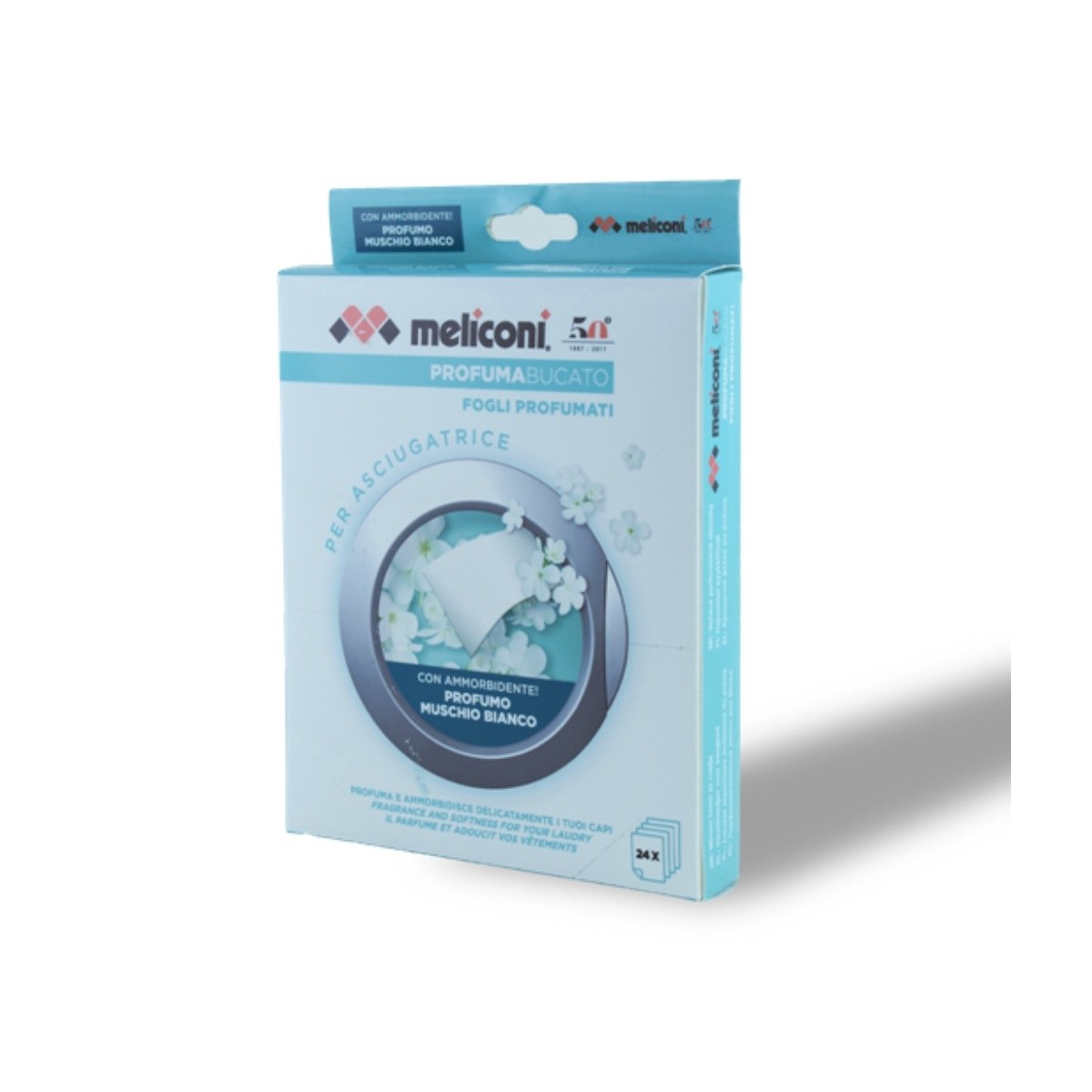 Meliconi ProfumaBucato. Tipo di prodotto: Fragranza per asciugatrice, Colore del prodotto: Bianco, Profumo: Muschio bianco. Tipo di imballo: Scatola, Quantità per pacco: 24 pezzo(i)