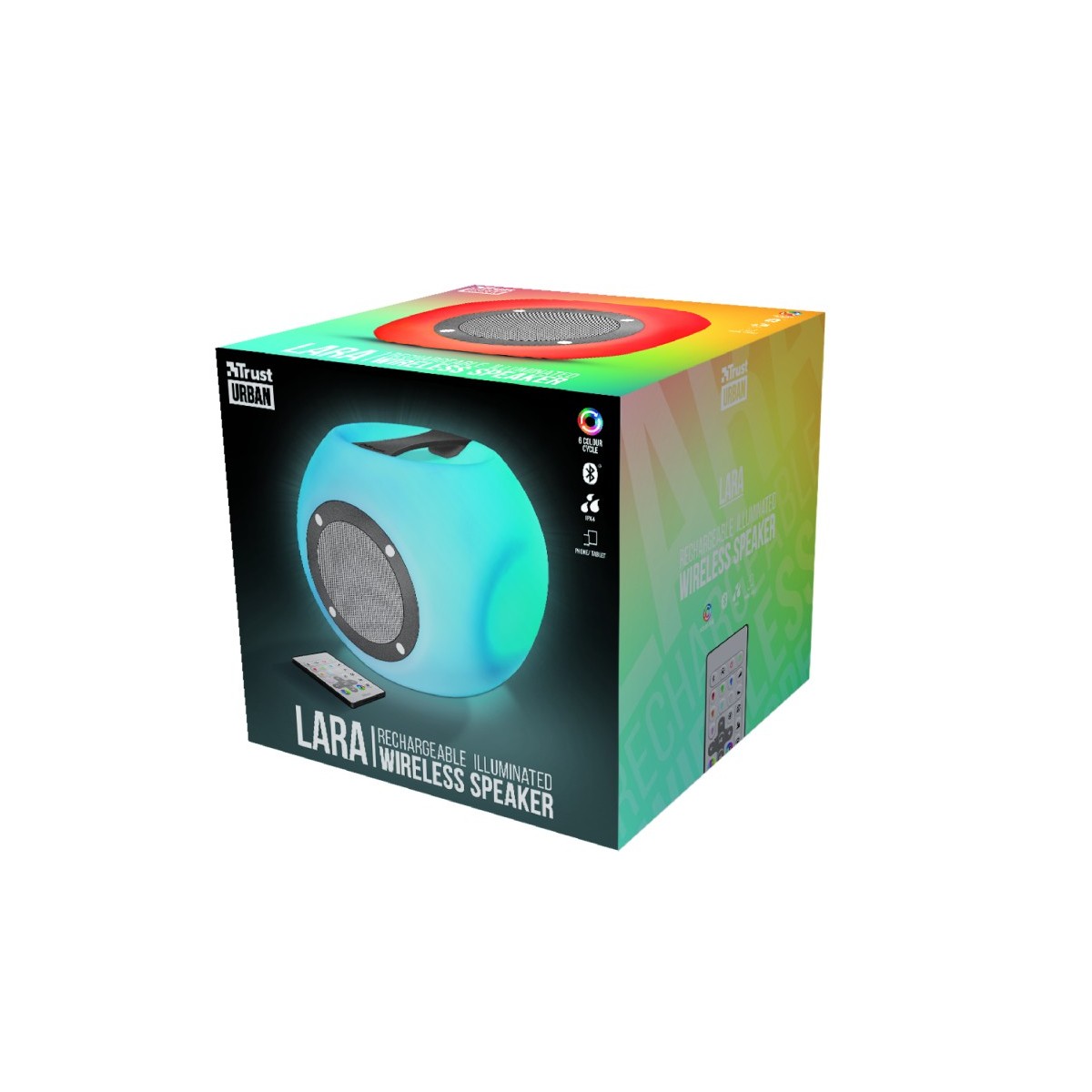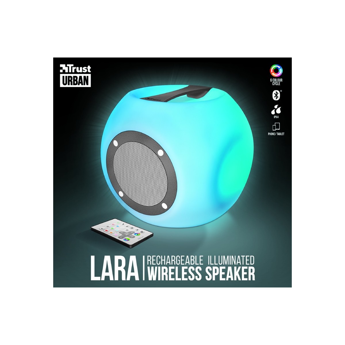 Trust Lara. Diametro dell'unità: 10 cm. Potenza in uscita (RMS): 10 W, Range di frequenza: 20 - 20000 Hz, Impedenza: 4 Ω. Tecnologia di connessione: Senza fili, Portata Bluetooth: 10 m, Connettore USB: Micro-USB. Colore del prodotto: Bianco, Funzioni di protezione: Impermeabile, colore d'illuminazione: Multi. Utilizzo raccomandato: Universale