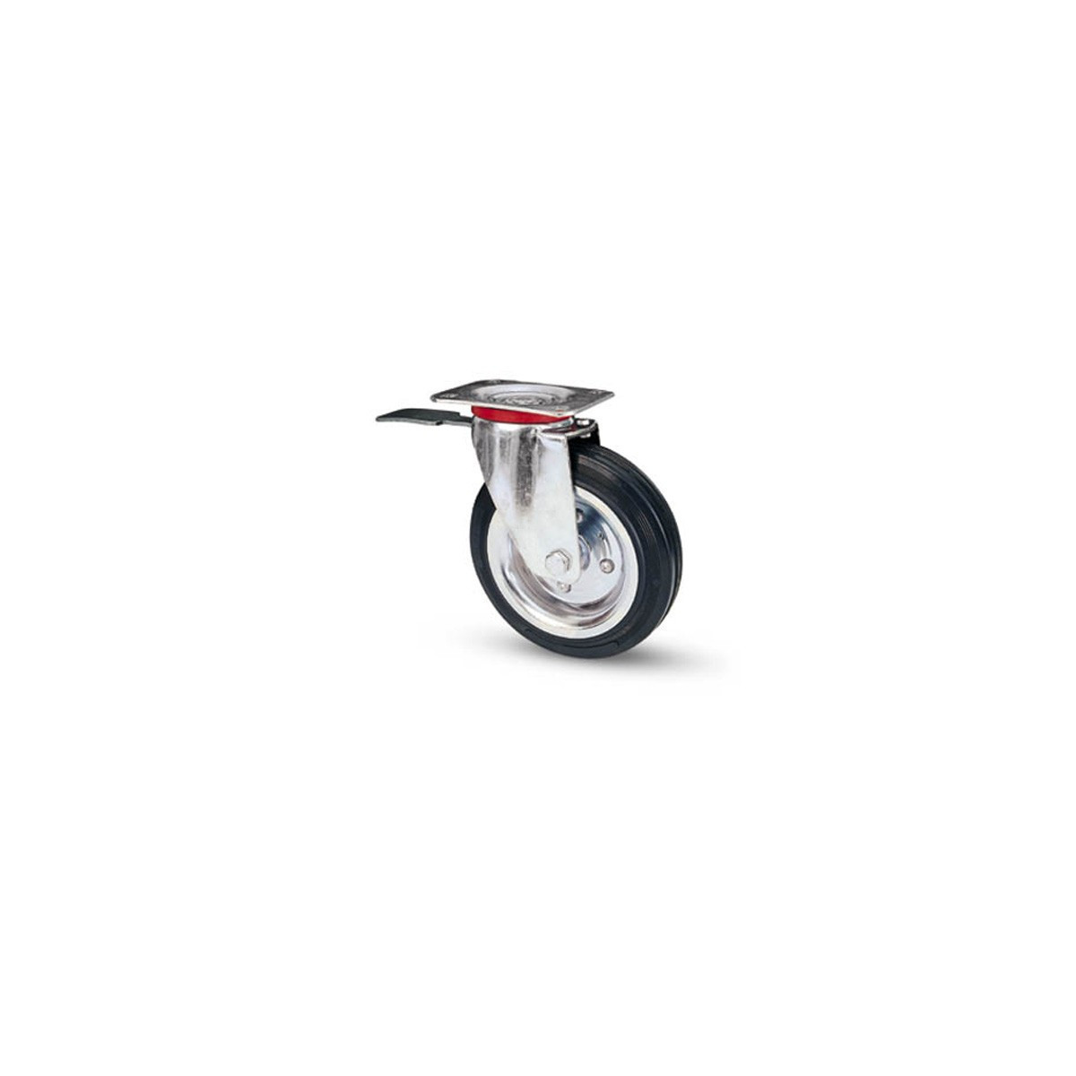 Ruota industriale con rivestimento in gomma e flange in acciaio. Su piastra girevole, con freno. Articolo 80/Bis. art. 8692-8693-8694-8695 piastra 100x 85art. 19513 piastra 140x110.