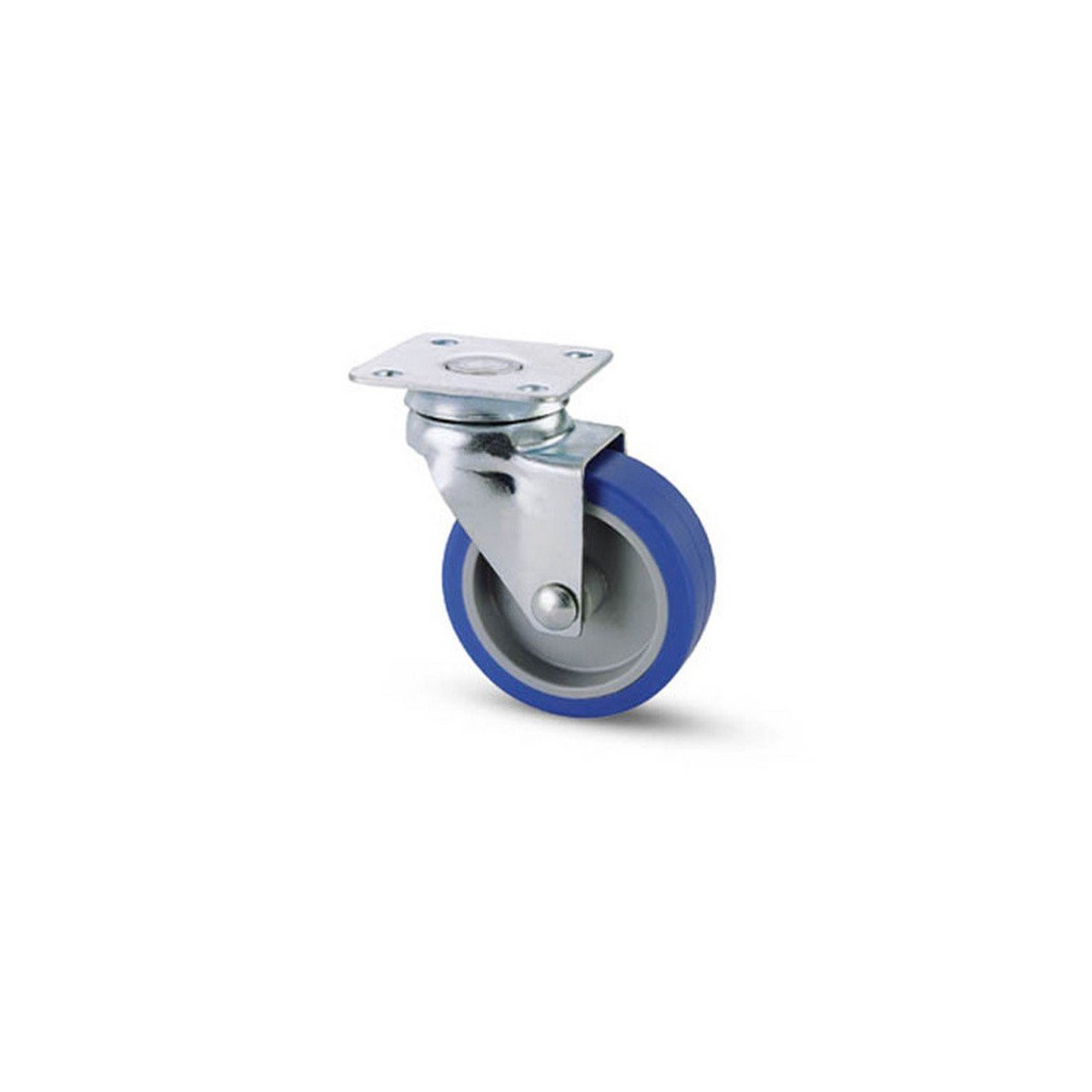 Ruota in gomma sintetica blu, flangiata in materiale plastico antiurto. Su piastra girevole su doppia corona di sfere. l'impiego e' consigliato per mobili d'ufficio, espositori, elettrodomestici, attrezzature ospedaliere, ecc... Articolo 221. Piastra misura 40x40 per gli articoli 19491, 0650192 e 0650194. Misura 60x60 per gli articoli 19492, 19493, 19494.