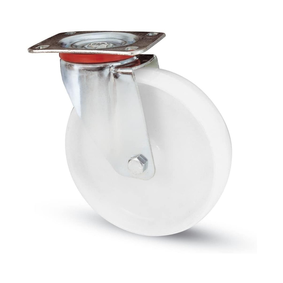 Ruota in poliamide 6. Supporto tipo medio in acciaio stampato zinco-cromato rotanti su doppia corona di sfere. Assemblaggio con dado autobloccante. Anello parapolvere sul giro di sfere. Piastra misura 100x 85.
