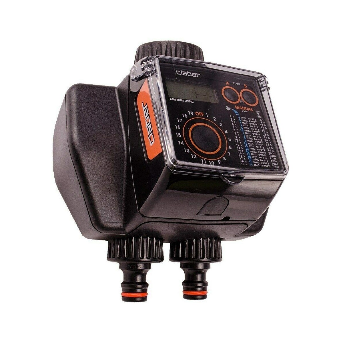 Claber 8485 Programmatore Dual Logic automatico a 2 vie. Funziona con 2 batterie alcaline stilo AA da 1,5V. Facile programmazione con un pulsante digitale (19 programmi pre-impostati + off). Schermo LCD ad alta leggibilit{. Resiste agli urti ed alle interperie, attacco a rubinetto da 3/4" con ghiera pivottante. Predisposto per il collegamento con il sensore di pioggia Rain Sensor. Pressione 5 bar, portata 41 litri al minuto.
