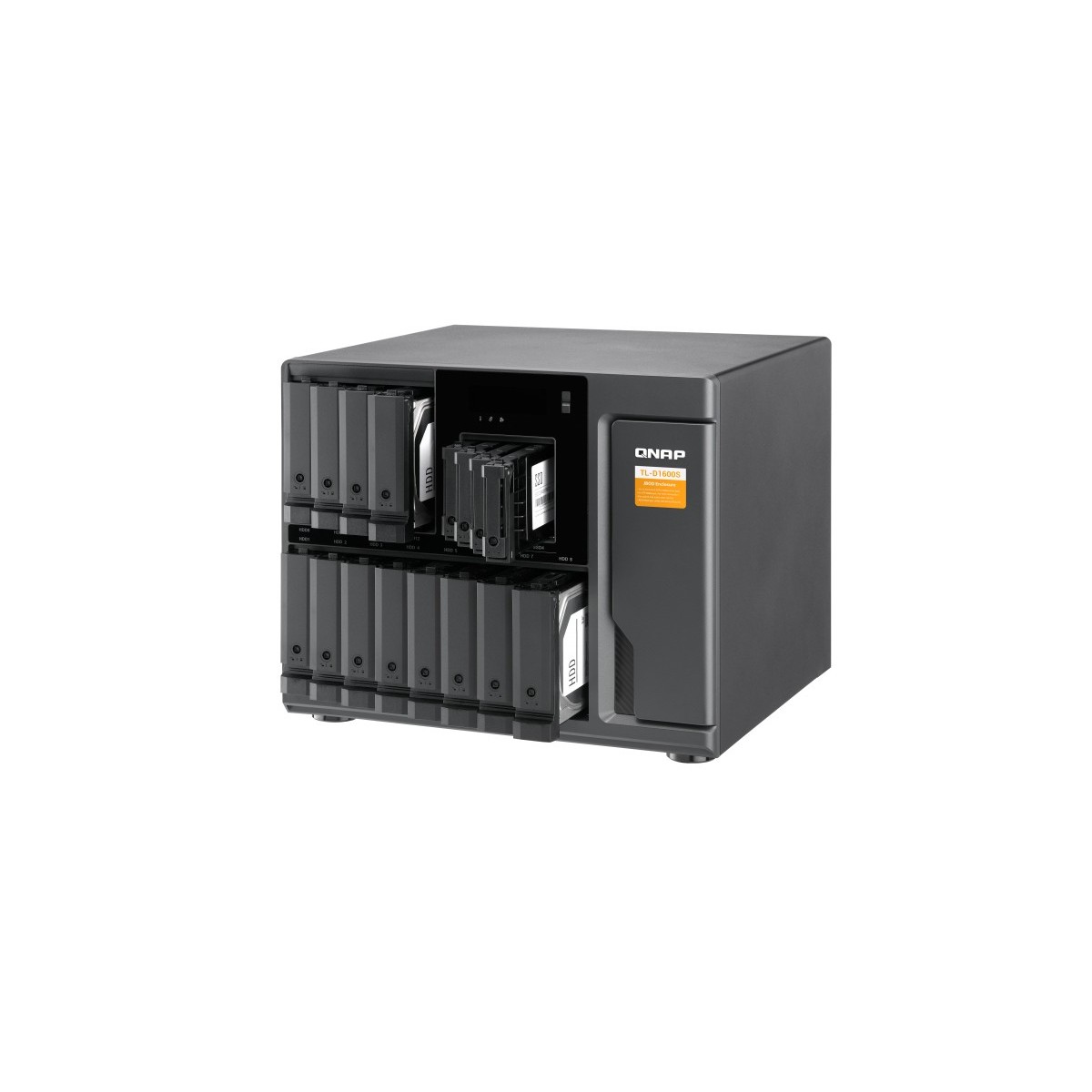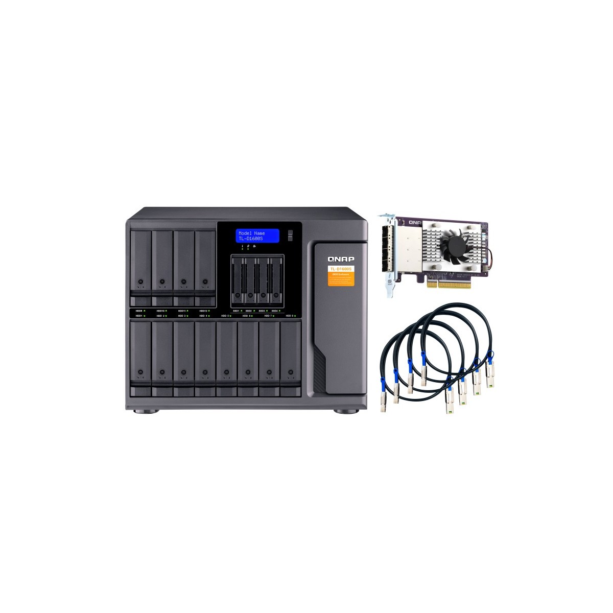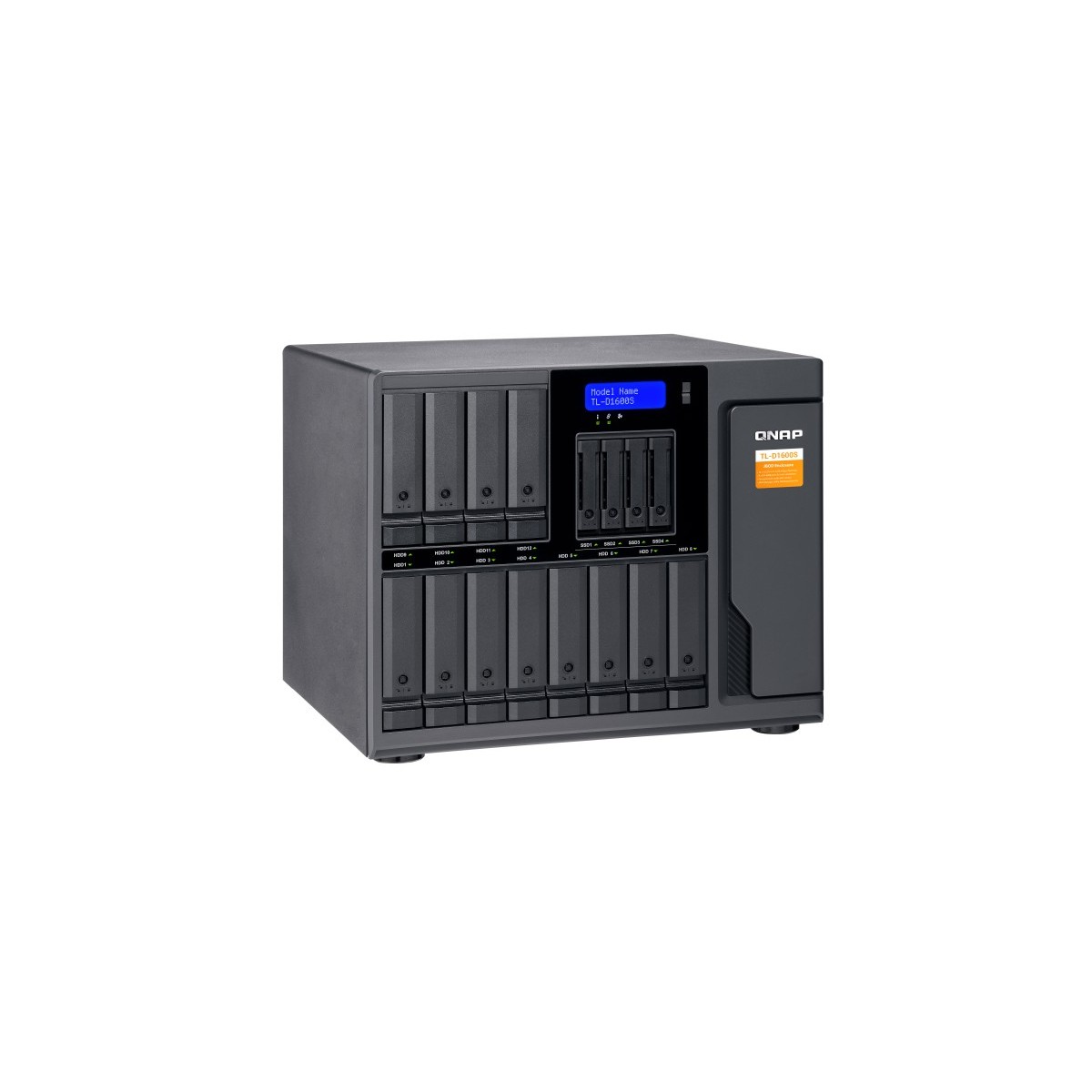 QNAP TL-D1600S. Tipo di prodotto: Enclosure HDD/SSD. numero di dispositivi di archivio supportati: 16, Dimensione del dispositivo di archiviazione: 2.5/3.5", Interfacce dell'unità di archiviazione supportate: Seriale ATA II, Serial ATA III. Velocità di trasferimento dati: 6 Gbit/s. Hot-swap. Tipo di display: LCD, Colore del prodotto: Nero, Grigio