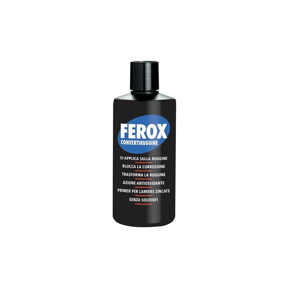 Prodotto per il trattamento della ruggine e per la protezione di tutte le superfici ferrose: arrugginite, nuove, verniciate e non. Pratico beccuccio dosatore. Pronto all'uso, facile e rapido da usare, resa elevata. Bassissima tossicità, Ferox è a base di resine sintetiche disperse in acqua e non contiene solventi: applicabile anche in ambienti chiusi o poco ventilati. Reagisce chimicamente con la ruggine, trasformandola in un complesso stabile, di colore nero, che una volta sovraverniciato resiste all'attacco degli agenti atmosferici ed è impermeabile all'umidità. Efficace anche su zone verniciate o su manufatti non arrugginiti, dove forma uno strato trasparente. Sovraverniciabile con qualsiasi tipo di vernice, all'acqua o al solvente. MODALITA' D'USO: Eliminare eventuale ruggine a scaglie. Non applicare il prodotto a temperature inferiori a 5°C, o in eccessiva umidità. Versare la quantità necessaria di prodotto in un recipiente di plastica. Non riversare l'eventuale prodotto non utilizzato nel contenitore originale. Sovraverniciare le superfici trattate entro 24/36 ore dall'applicazione. SPECIFICHE DI UTILIZZO: Resa teorica a pennello 15-20 mq. Essiccazione a 20°C. Asciutto al tatto in 15'/30'. Intervallo di tempo fra le 2 mani: 15'/30'. Sovraverniciabile con lo smalto di finitura dopo 12 ore ed entro 24/26 ore dall'applicazione.