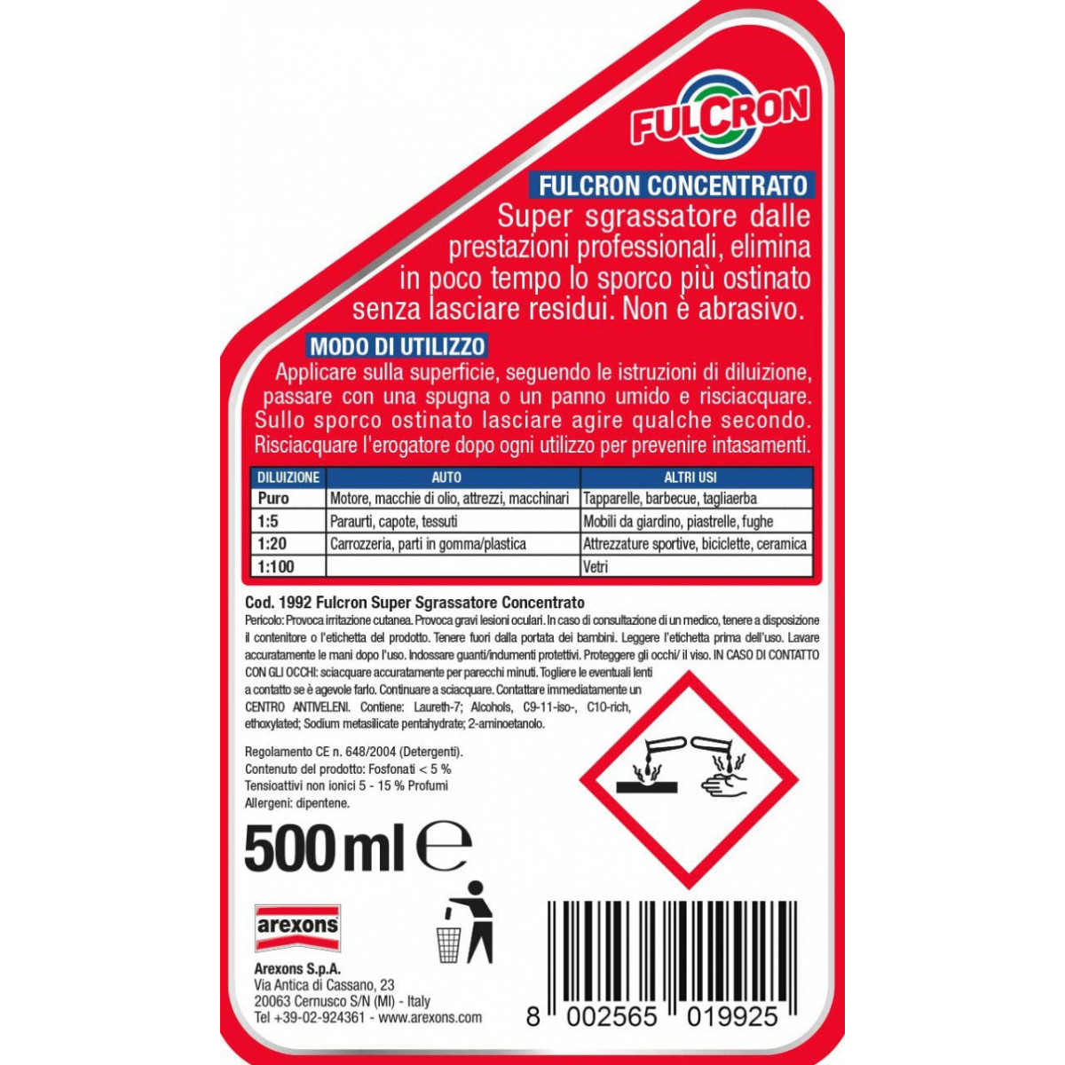 Fulcron Super sgrassatore concentrato è sicuro perchè non è nocivo, non è tossico, non è aggressivo, alle diluizioni consigliate. Non è infiammabile, non è abrasivo, non contiene ammoniaca, fosfati e coloranti. Non usare puro sui vetri, usare solo alla diluizione indicata.
