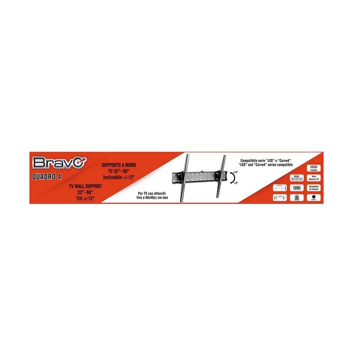 Bravo Supporto Tv QUADRO 4. Supporto inclinabile da parete per televisori LCD/Plasma e CURVED. Adatto a schermi da 32" a 60". Telaio in ferro zincato. Colore nero.