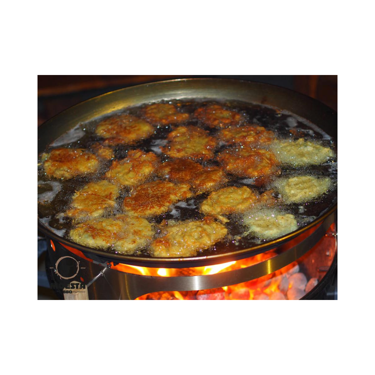 Spinto dal tuo BBQ bollitore con carbone e legna da ardere. Il carbone fornisce la temperatura di base, la legna da l'alta temperatura necessaria durante una frittura (può essere utilizzata temporaneamente secondo necessità).