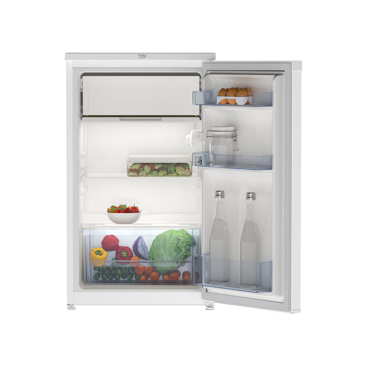 Beko TS190330N. Capacità netta frigorifero: 86 L, Classe climatica: SN-ST, Emissione acustica: 36 dB. Numero di ripiani frigorifero: 2, Numero di cassetti per verdura: 1, Cerniera porta: Destra. Consumo energetico annuo: 112 kWh, Classe efficienza energetica: F. Peso: 21,7 kg. Colore del prodotto: Bianco