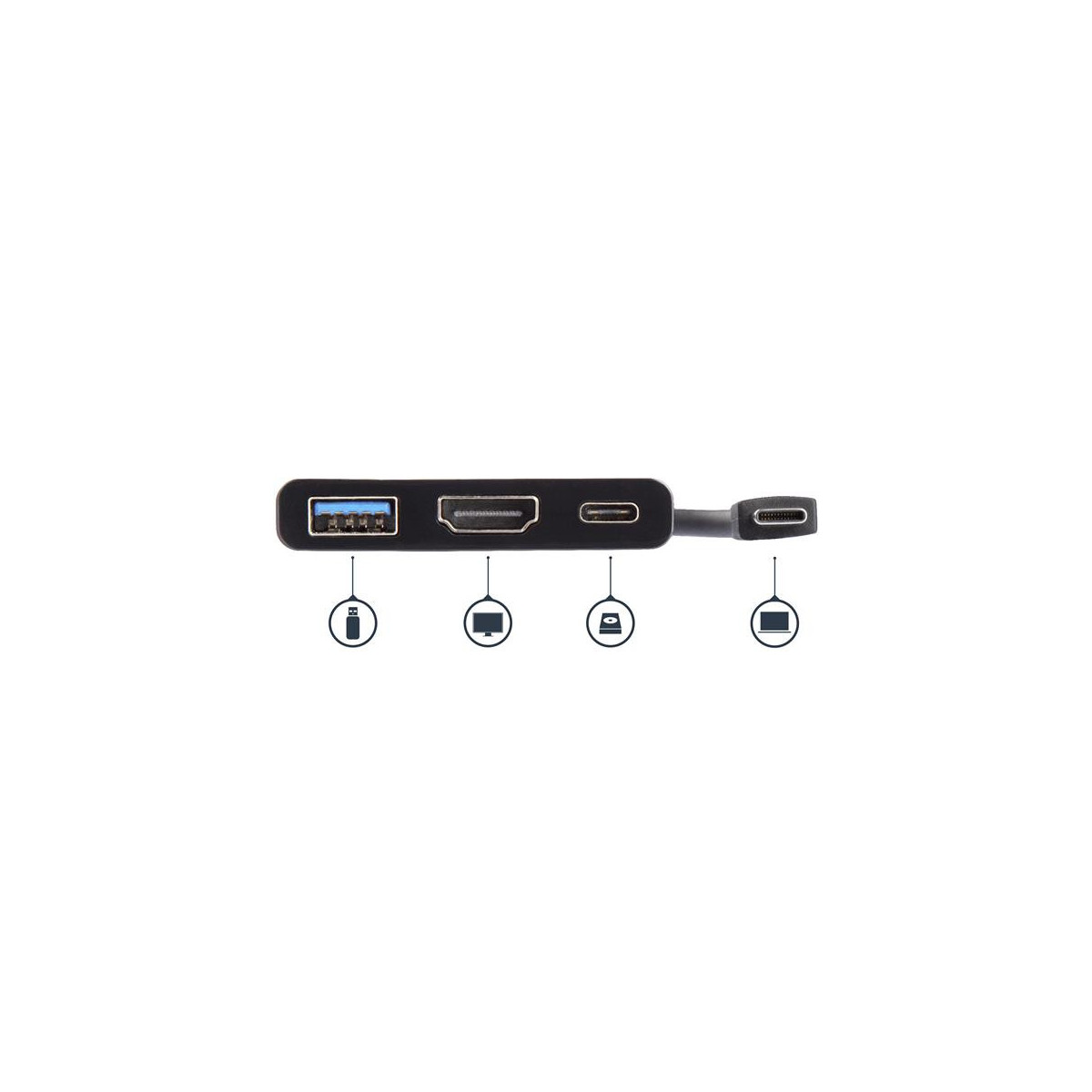 Adattatore universale multifunzione che consente di estendere la connettività di un computer laptop o di un MacBook grazie alla tecnologia USB-C. Il computer laptop può essere collegato a un display HDMI 4K e contemporaneamente a un dispositivo USB 3.0 tradizionale. Se utilizzato insieme all'adattatore di alimentazione del computer laptop, l'adattatore multiporta funge da fonte di alimentazione per ricaricare e mantenere il livello di carica della batteria del computer laptop.
