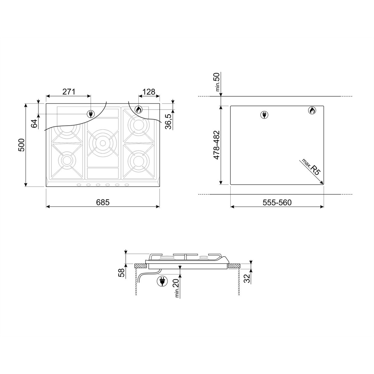 Smeg SR275X2. Colore del prodotto: Acciaio inossidabile, Posizionamento dell'apparecchio: Da incasso, Tipo di piano cottura: Gas. Materiale di supporto della pentola: Acciaio inossidabile, Materiale della scocca: Metallo. Tipo di controllo: Manopola, Posizione di controllo: Frontale. Potenza aggregata (elettrica): 1 W, Potenza aggregata (gas): 10900 W, Tensione di ingresso AC: 220 - 240 V. Larghezza: 685 mm, Profondità: 500 mm, Altezza: 74 mm