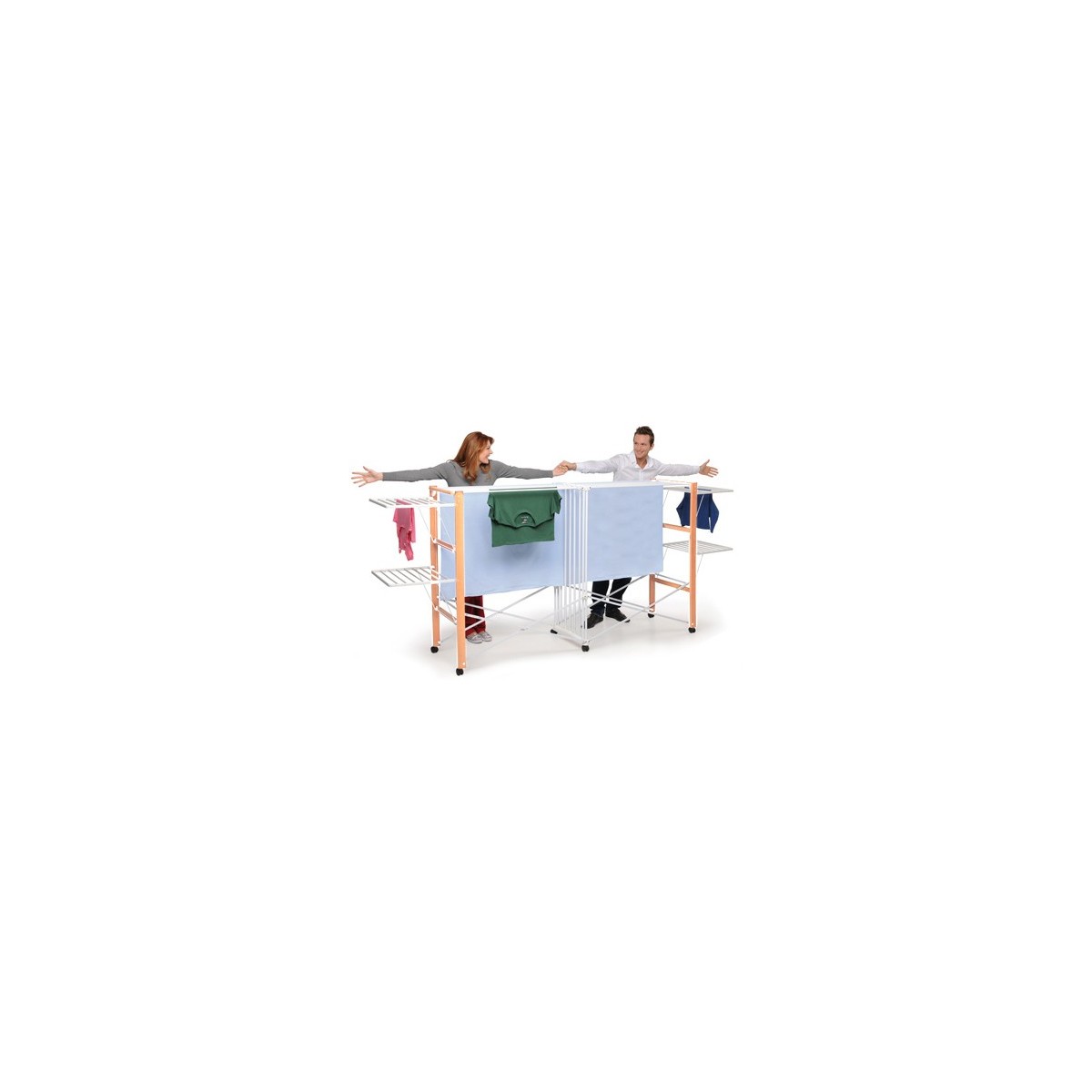 Allungo ha ali laterali indipendenti che si aprono anche separatamente, in base alla quantità di bucato da stendere. E' solido e durevole nel tempo grazie alla struttura in legno massiccio di faggio verniciato, disponibile in due varianti di colore: naturale e noce.