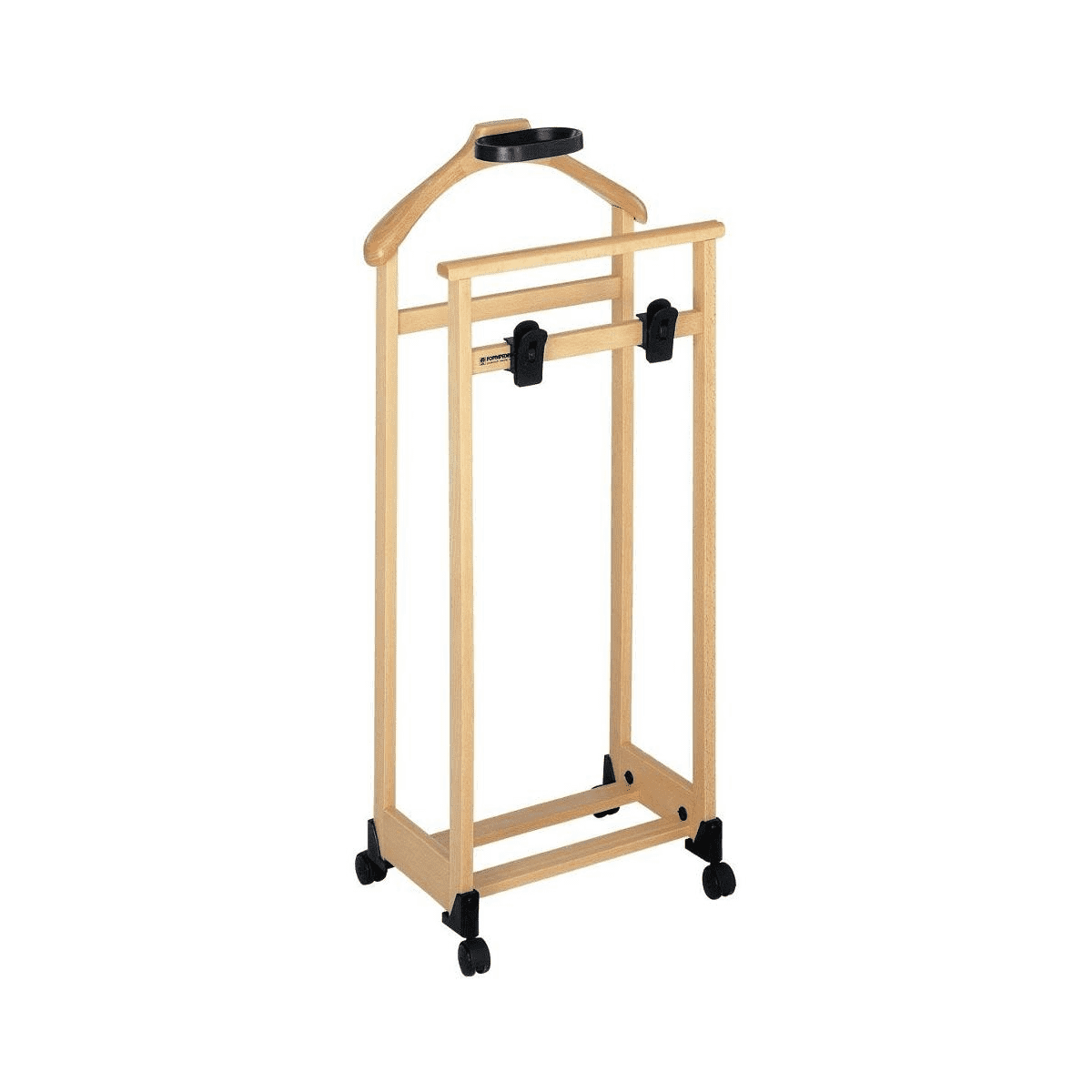 La struttura in legno massiccio di faggio ha una spalla per giacche e camicie, una staffa porta pantaloni con pinze regolabili per appendere le gonne e una base porta scarpe. Si sposta facilmente grazie alle ruote piroettanti antigraffio e ha anche una vaschetta porta oggetti.