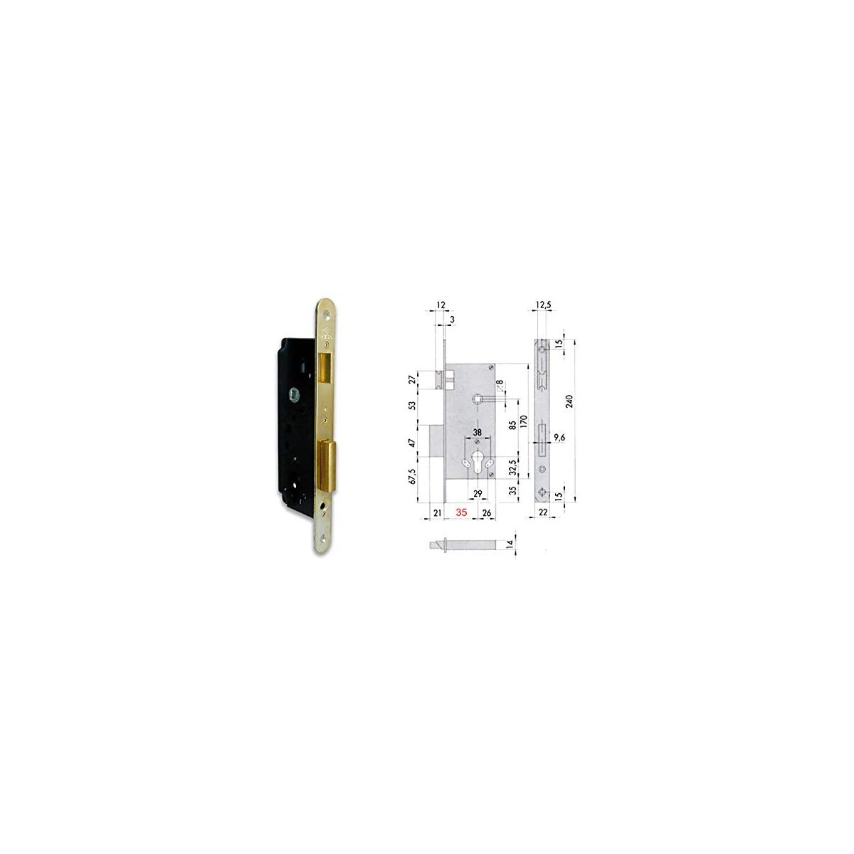 Cisa 5C130 Serratura da infilare per cilindro europeo, catenaccio e scrocco, quadro maniglia, frontale mm.22, bordo tondo. Catenaccio a 2 mandate, scrocco reversibile. Contropiastra in dotazione. Fornita senza cilindro.