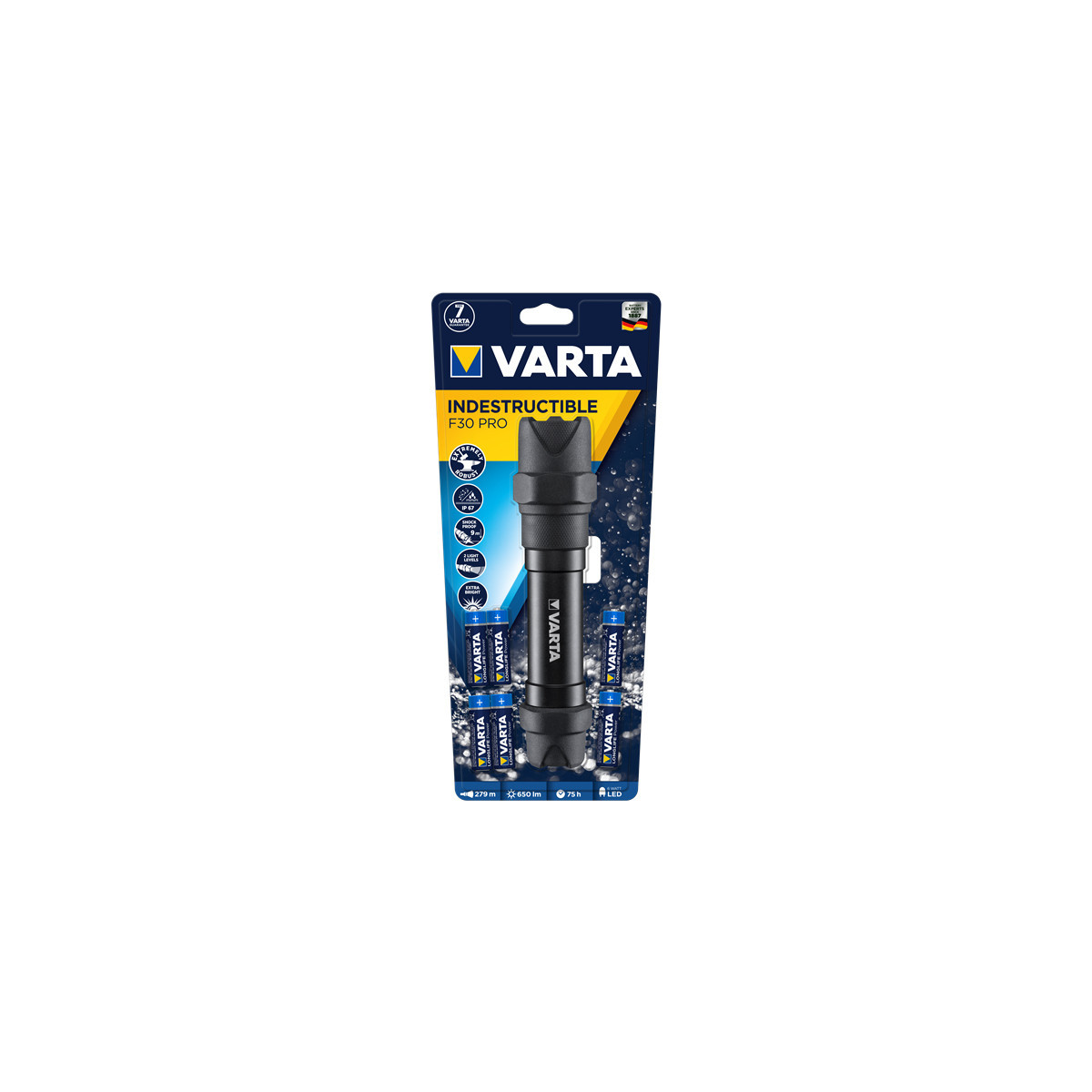 Varta INDESTRUCTIBLE F30 PRO. Tipo di lampada: Torcia a mano, Colore del prodotto: Nero, Materiale della scocca: Alluminio. Tipo di lampada: LED, Potenza della lampada: 6 W, Flusso luminoso: 650 lm. Tipo batteria: Stilo AA, Durata batteria: 75 h. Profondità: 228 mm, Peso: 507 g, diametro testa: 5,45 cm