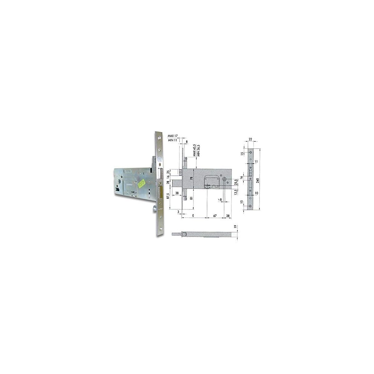 Cisa 57357.90.0 Serratura da infilare per fasce, doppia mappa, 4 mandate, scrocco reversibile, regolabile da 11 a 17 mm., attacco per aste interne, quadro maniglia, fornita con 3 chiavi. Dimensioni: entrata mm.90.