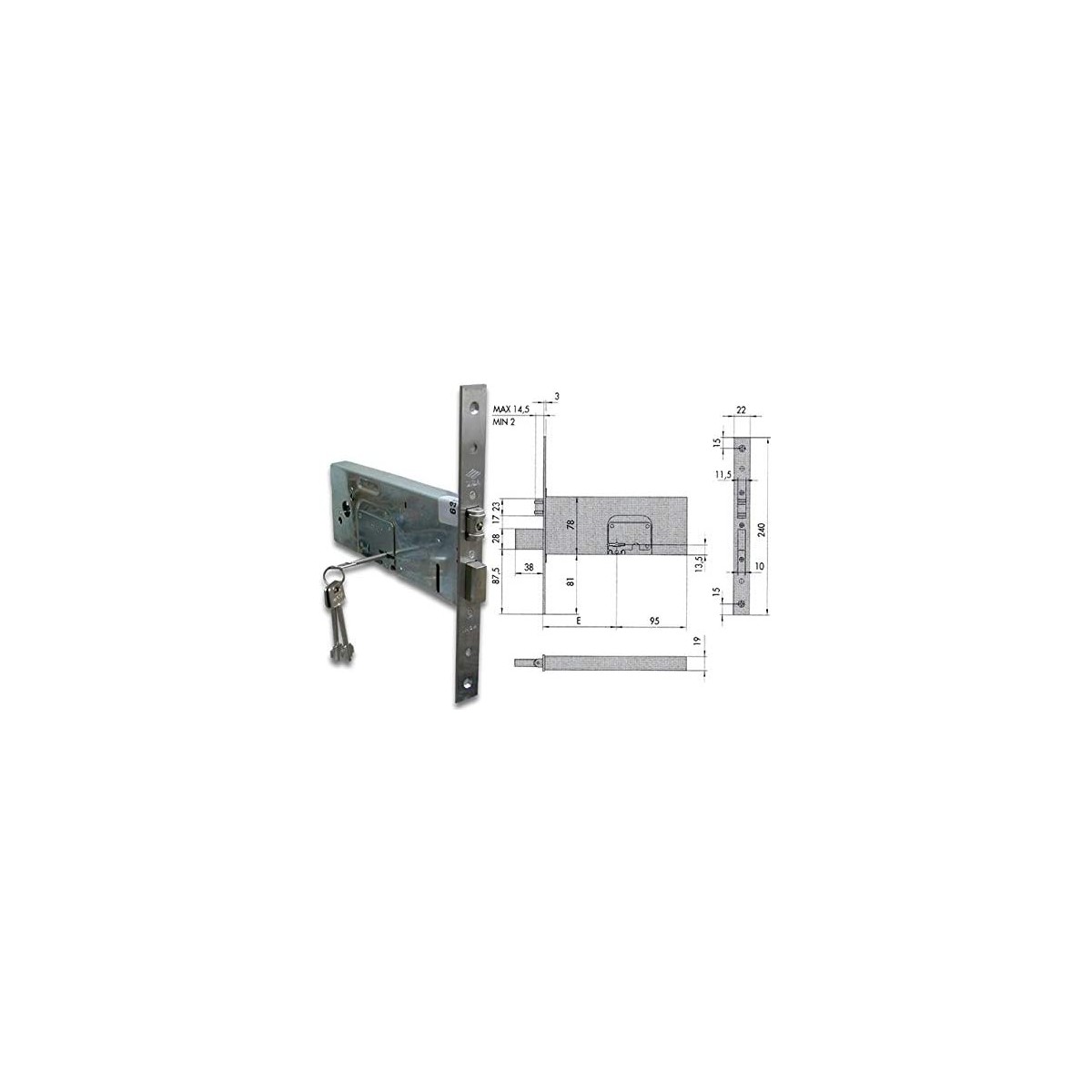 Cisa 57360.90.0 Serratura da infilare per fasce, doppia mappa, 4 mandate, scrocco a rullo, regolabile da 2 a 14,5 mm., quadro maniglia, fornita con 3 chiavi. Dimensioni: entrata mm.100.