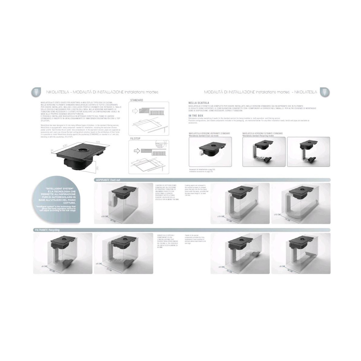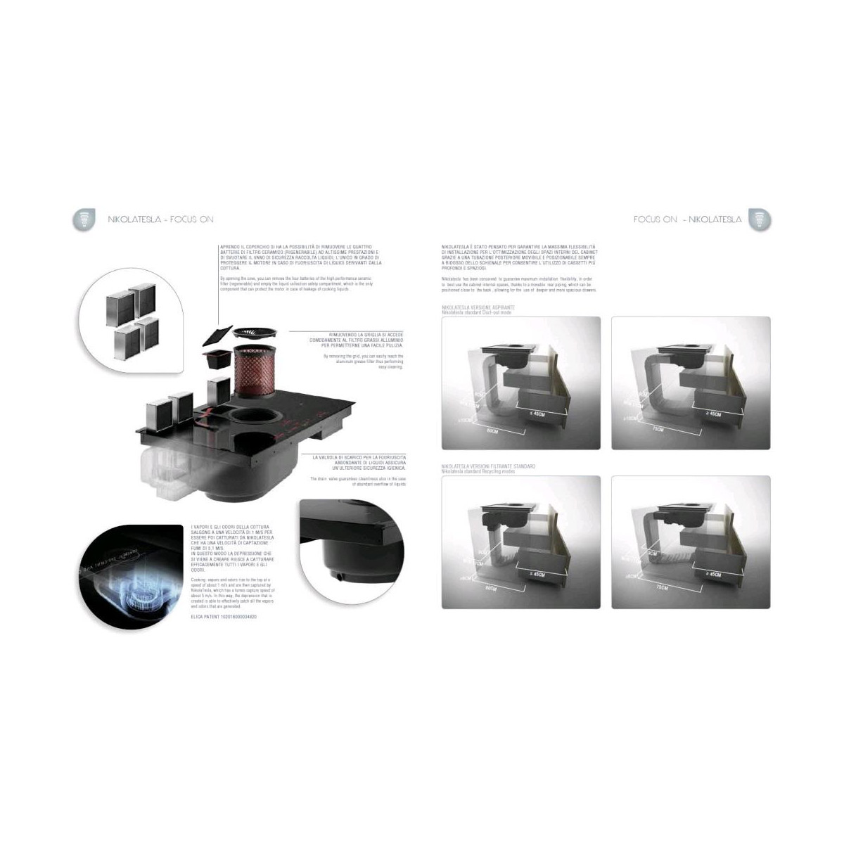 NikolaTesla, è il nuovo piano induzione aspirante Elica. Design distintivo, linee decise e materiali di alta qualità, NikolaTesla combina sinergicamente le funzionalità di due elettrodomestici: la cappa aspirante, posizionata nella zona centrale, comunica direttamente col piano a induzione ed è in grado di recepire le informazioni provenienti dalle zone cottura, regolando automaticamente la potenza e la velocità di aspirazione. Con Nikola Tesla potrai concentrarti e vivere con piacere il momento della cottura e della preparazione dei cibi sul nuovo senza più preoccuparti dei fumi e degli odori: alla qualità dell’aria ci pensa Elica con suo il nuovo piano induzione aspirante. I nuovissimi e performanti filtri odori ceramici del sistema di aspirazione, disponibili nella versione filtrante di NikolaTesla, sono direttamente accessibili dalla parte superiore del piano: rimuovendo la griglia di accesso i filtri possono essere estratti e puliti con grande facilità.