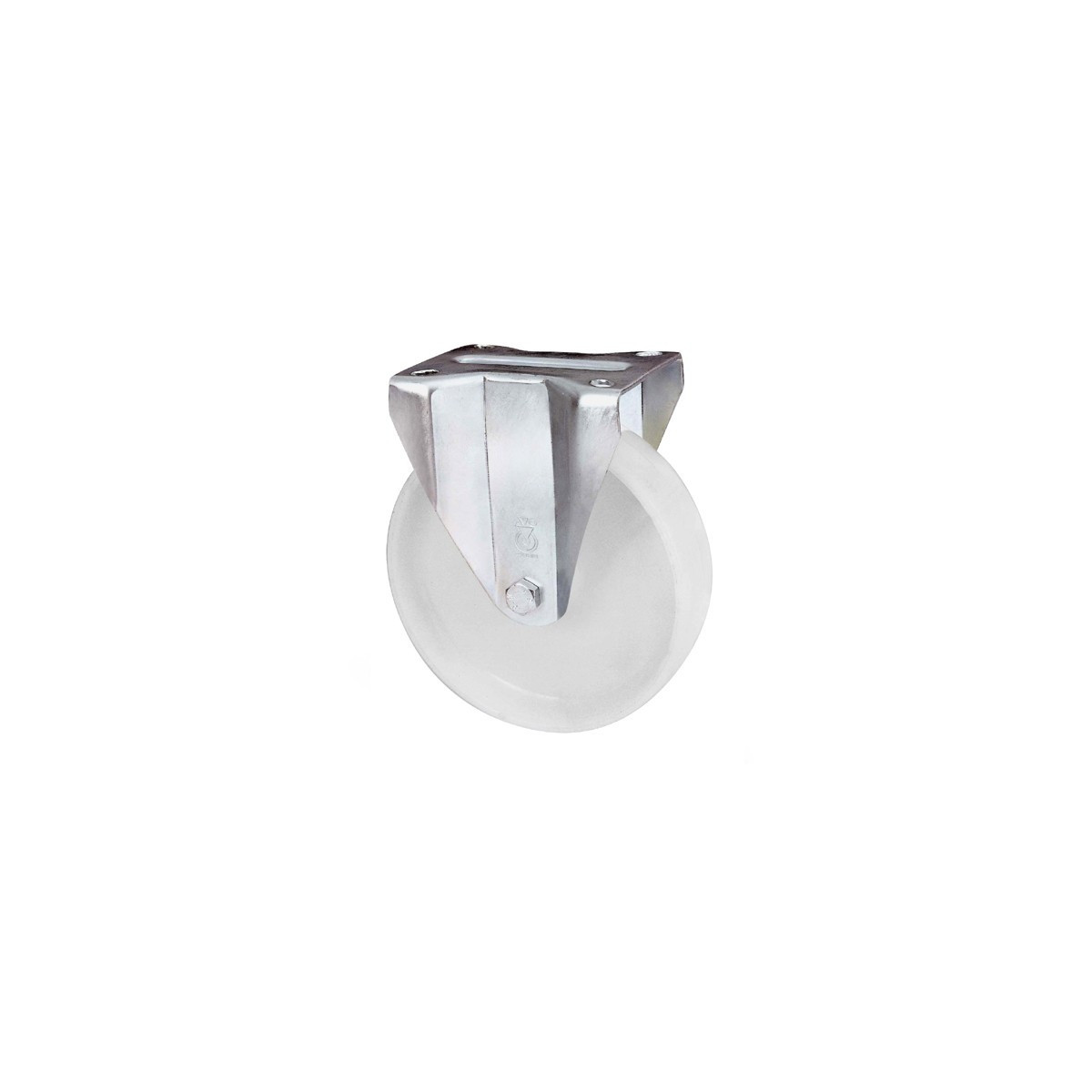 Ruota in poliamide 6. Supporto tipo medio in acciaio stampato zinco-cromato. Assemblaggio con dado autobloccante. Piastra misura 100x 85.