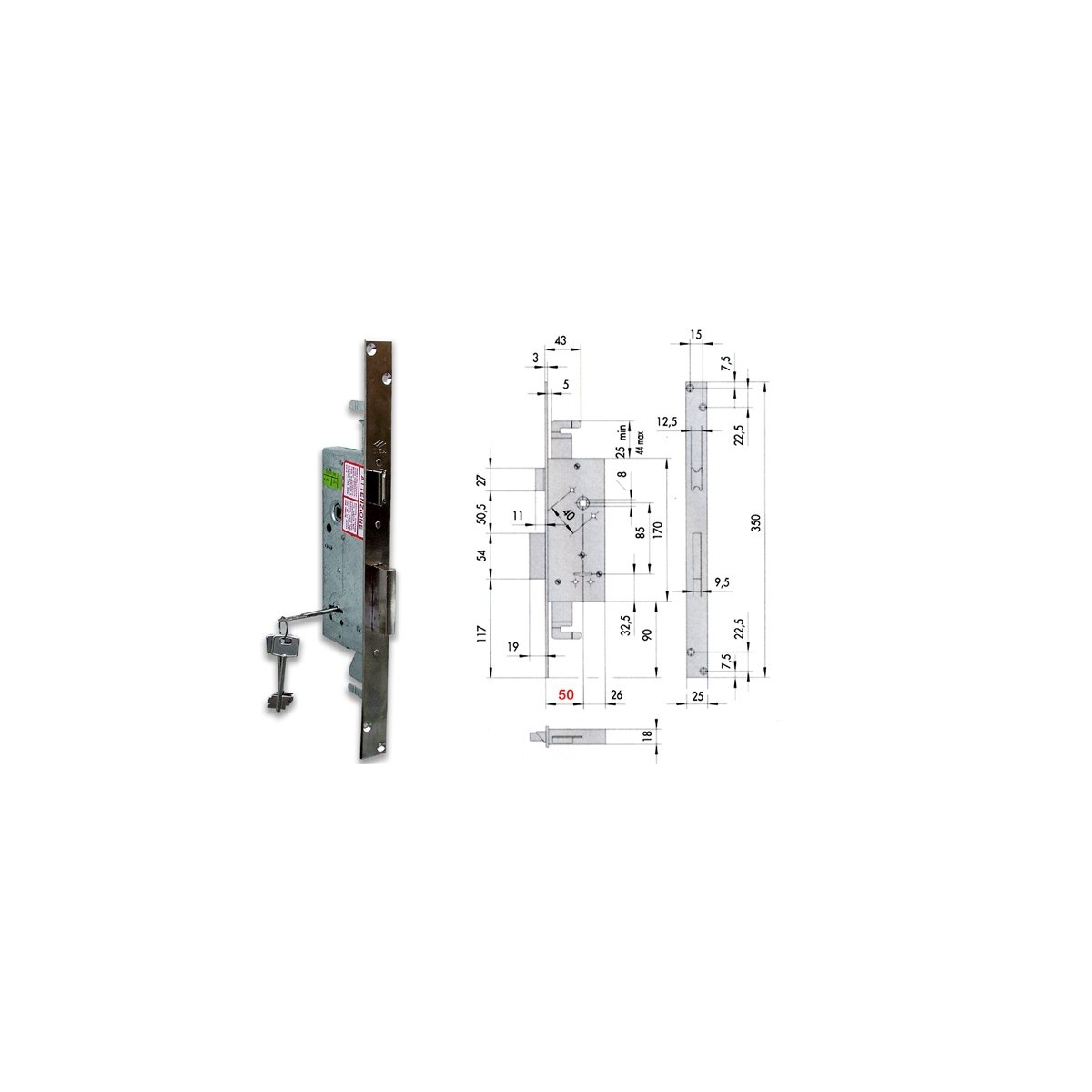 Cisa 57215 Serratura da infilare a doppia mappa, 2 mandate, scrocco reversibile, attacco per aste interne, quadro maniglia, fornita con 3 chiavi.
