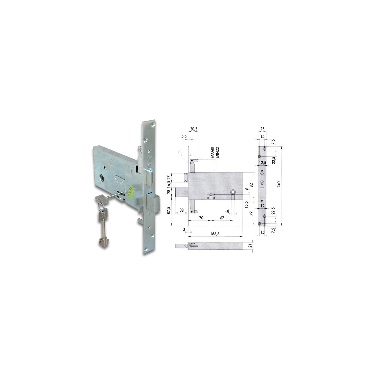 Cisa 57317.73.0 Serratura da infilare per fasce a doppia mappa, 4 mandate, scrocco, attacco per aste interne, quadro maniglia, fornita con 3 chiavi. Dimensioni: entrata mm.70.