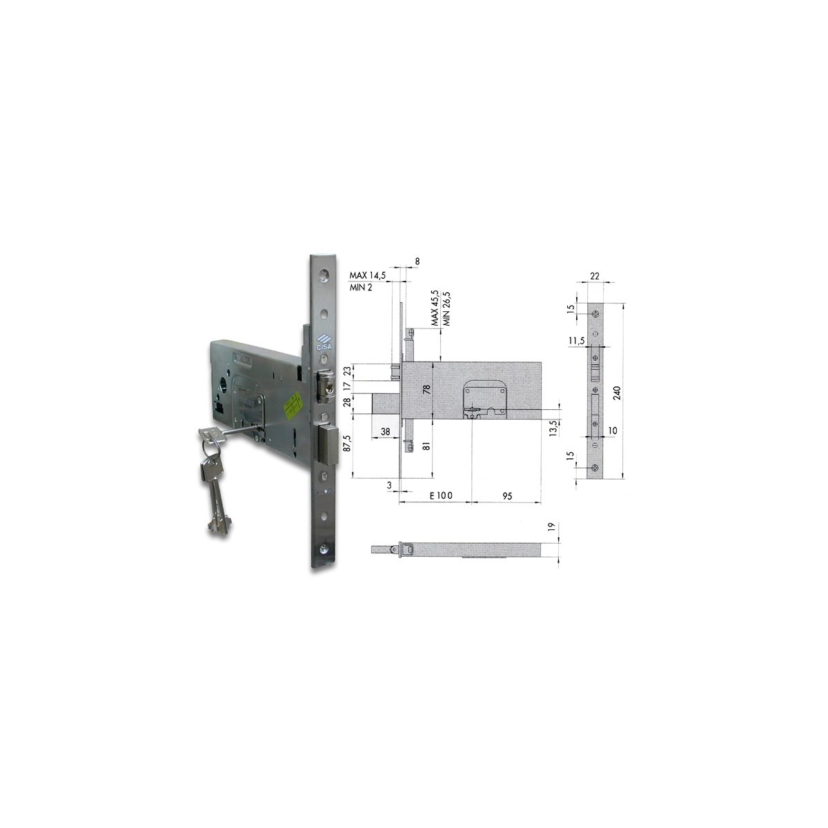 Cisa 57360.100. Serratura da infilare per fasce, doppia mappa, 4 mandate, scrocco a rullo, regolabile da 2 a 14,5 mm., quadro maniglia, fornita con 3 chiavi. Dimensioni: entrata mm.100.
