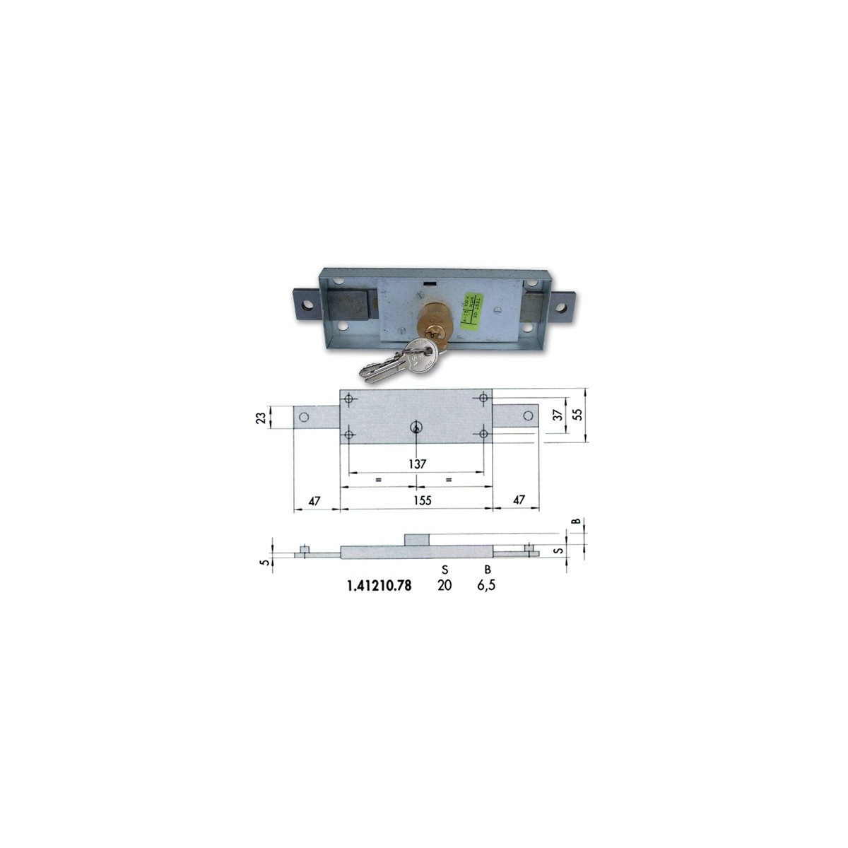 Cisa 41210.78.0 Serratura per serrande, centrale, fornita con 3 chiavi, 2 esterne + 1 interna. Dimensioni: mm.H55xL155xP13, sporgenza cilindro mm.6,5.