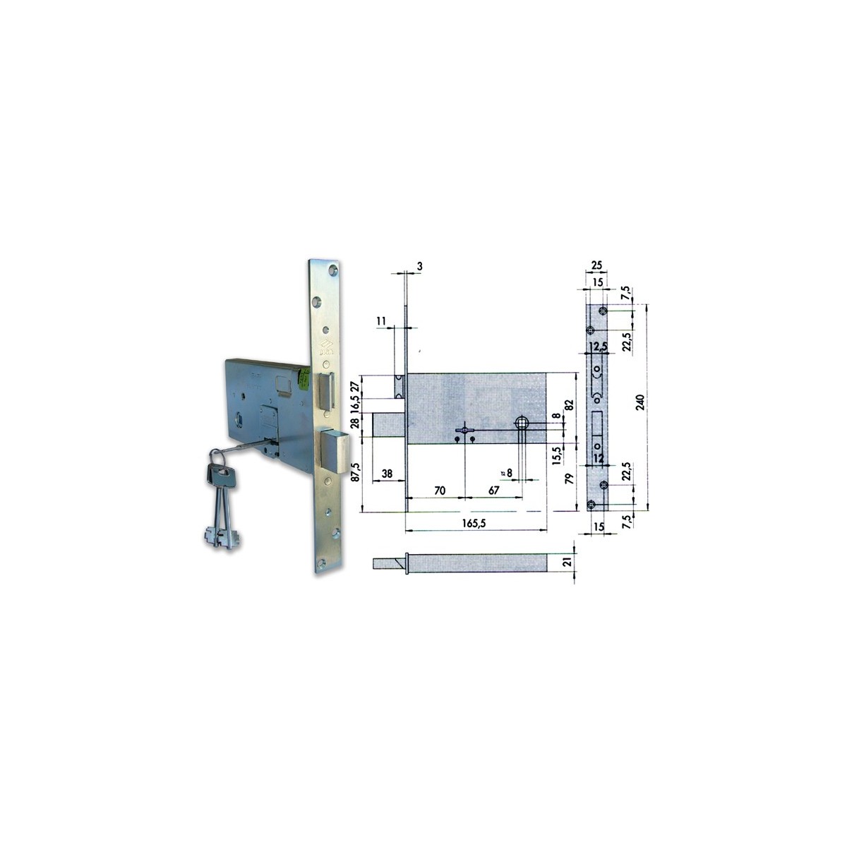 Cisa 57312.73.0 Serratura da infilare per fasce a doppia mappa, 4 mandate, scrocco reversibile, attacco per aste interne, quadro maniglia, fornita con 3 chiavi. Dimensioni: entrata mm.70.