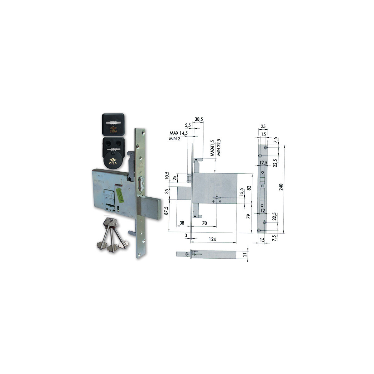 Cisa 57325.73.0 Serratura da infilare per fasce a doppia mappa, 4 mandate, scrocco a rullo, attacco per aste interne, fornita con 3 chiavi. Dimensioni: entrata mm.70.
