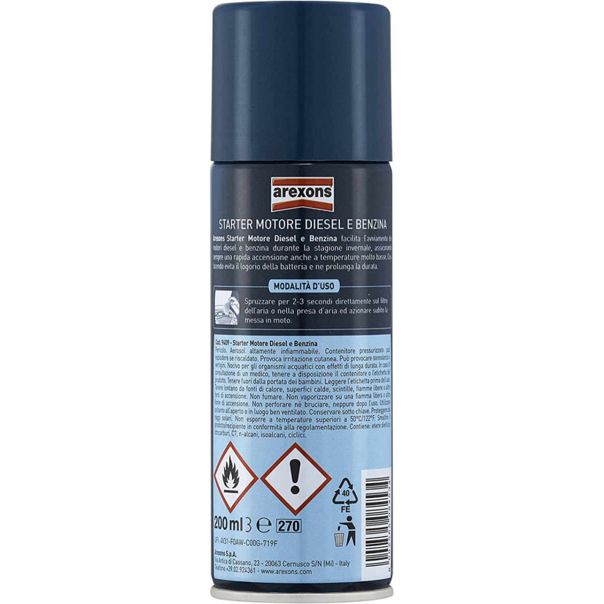 STARTER SPRAY Arexons. Facilita l'avviamento rapido alle basse temperature dei motori diesel e a benzina. Cosi' facendo evita il logorio della batteria e ne prolunga la durata. Confezione da 200 ml.