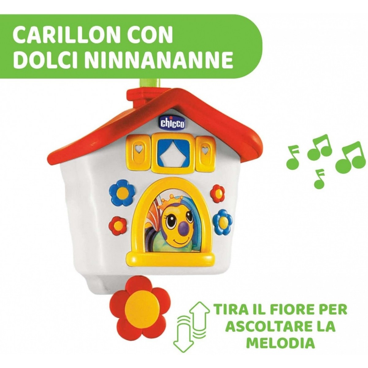 La Casina delle Api di Chicco si attiva facilmente: basta tirare il fiore alla base del carillon per attivare la ninna nanna rilassante e il movimento delle apine