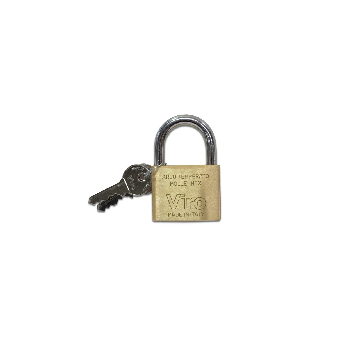 Viro lucchetto rettangolare. Corpo in ottone massiccio, con spigoli smussati antiabrasione. Arco in acciaio cementato e temprato (eccetto mm.20-mm.25). Chiavi n 2 in dotazione. Scrocchi n 2 molleggiati in ottone. (eccetto mm.20-mm.25).Anche in versione KA.