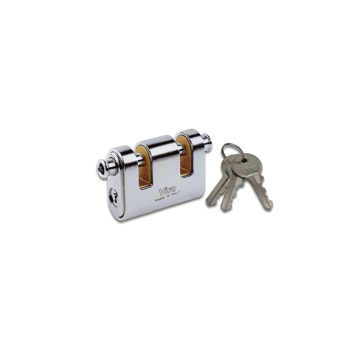 Viro lucchetto corazzato "Panzer". Corpo in ottone forgiato monoblocco. Corazza primaria in acciaio da mm.2,5 temprata. Corazze laterali in acciaio da mm.1,00 temprate. Barilotto a 7 pistoncini con protezione contro lo strappo e con piastrina antitrapano in acciaio. Asta di chiusura doppia. Chiavi n 3 in dotazione.