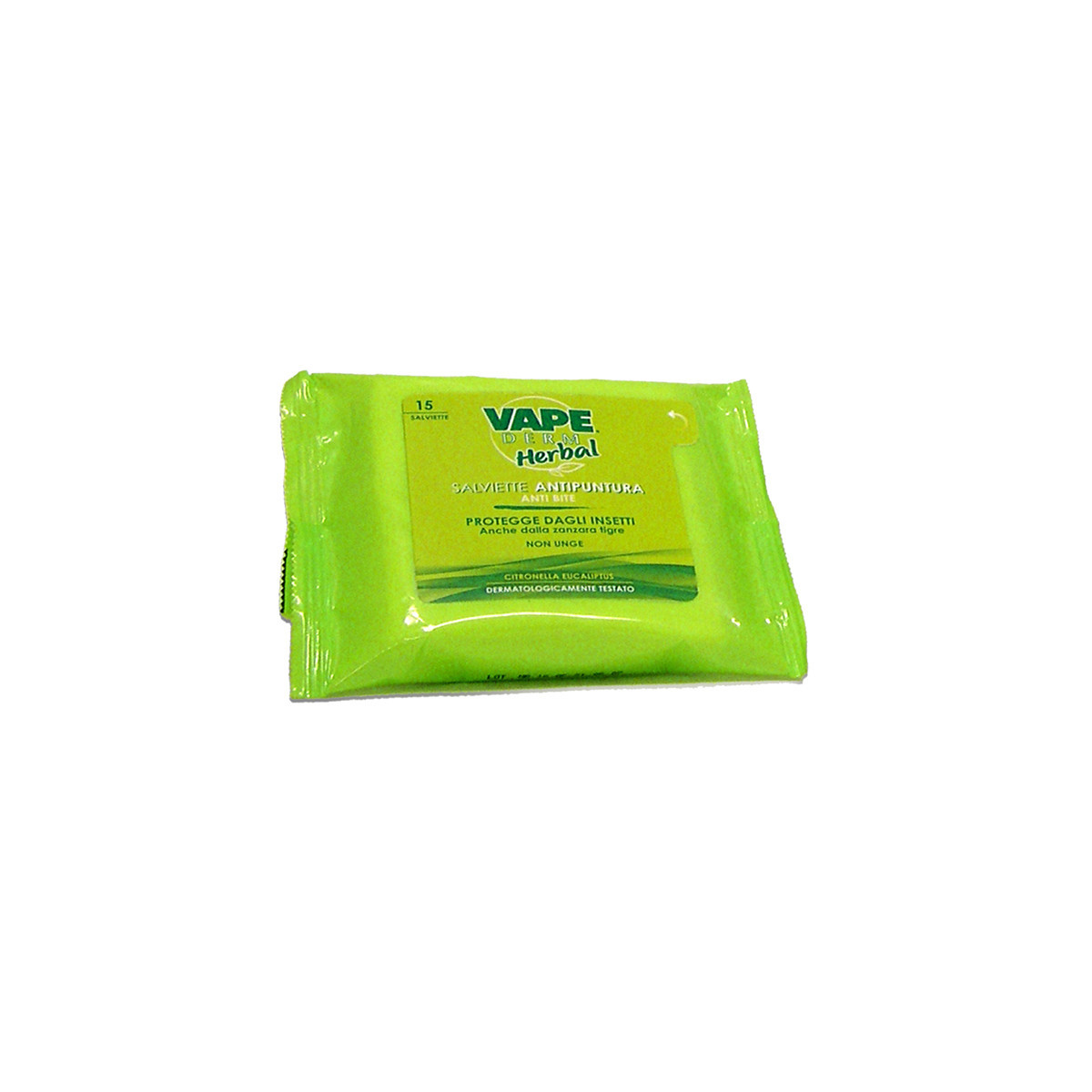 VAPE DERM SALVIETTE ANTIPUNTURA LINEA HERBAL 15 PEZZI. Al profumo di Citronella ed Eucaliptus, protegge la pelle dalle punture di zanzare, tafani, pappataci, moscerini ed altri insetti alati, mantendo la pelle morbida, idratata e profumata. Morbide salviette da utilizzare sulla pelle, piacevolmente profumate, pratiche ed efficaci per la protezione dalle punture di insetto.