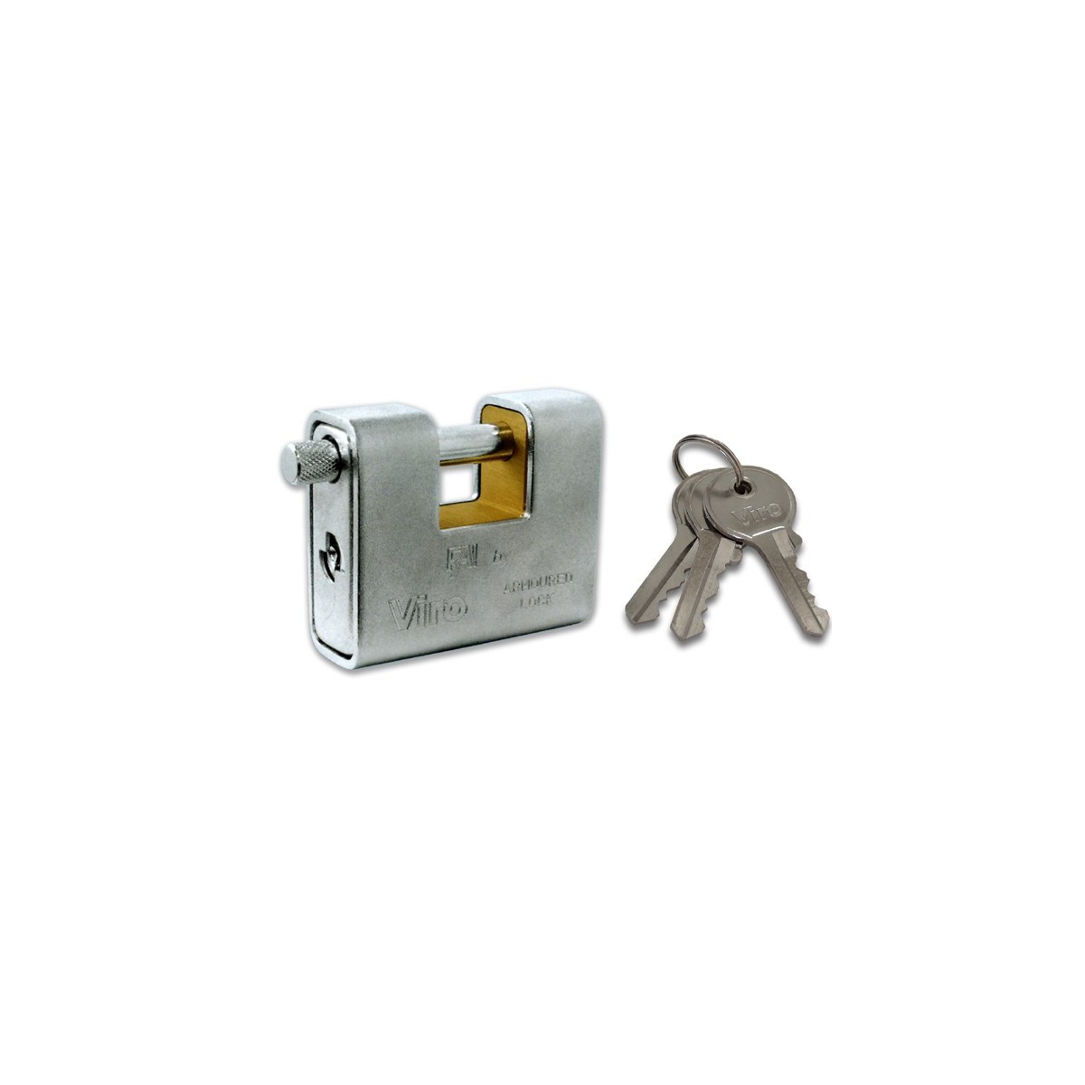 Viro lucchetto corazzato FAI by Viro. Corpo in ottone massiccio ricoperto da una corazza di acciaio cementato, temprato, ramato, nichelato e cromato. Asta di chiusura rotante in acciaio cementato. Barilotto protetto da una mostrina in acciaio. Chiavi n 3 in dotazione.