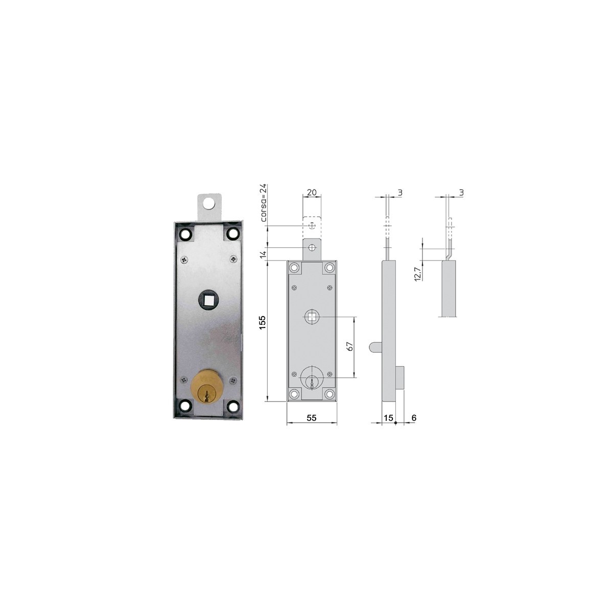 Viro 8235.6 serratura per porte basculanti con chiave a profilo simmetrico, in acciaio zincato. Dimensioni: mm.155x55. Altezza della cassa mm.15.