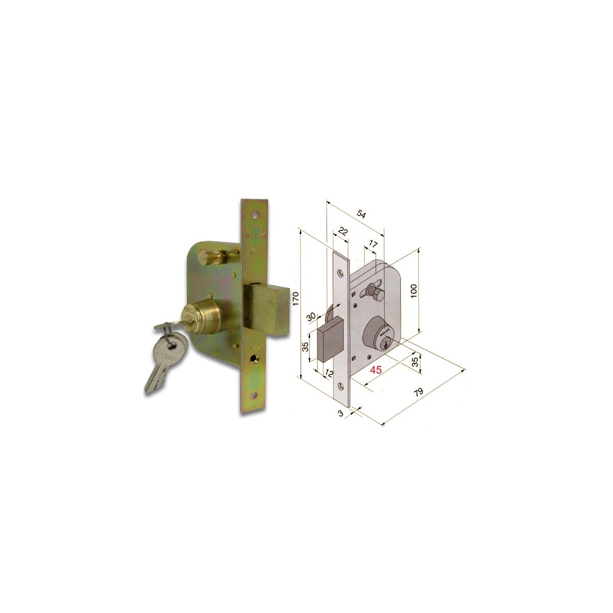 Welka 065.45.00.0 Serratura per cancelletti, 1 mandata con funzione di scrocco, pomolino per funzionamento scrocco svitabile, cilindro fisso, fornita con 3 chiavi. Dimensioni: frontale mm.H170xL22, scatola mm.H100xL79xP17, entrata mm.45.