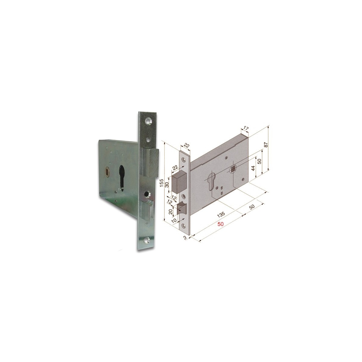 Welka 120.50.01.0 Serratura da infilare per serramenti, per cilindro europeo, 2 mandate, scrocco, quadro maniglia. Dimensioni: frontale mm.H155xL22, scatola mm.H87xL135xP17, entrata mm.50.