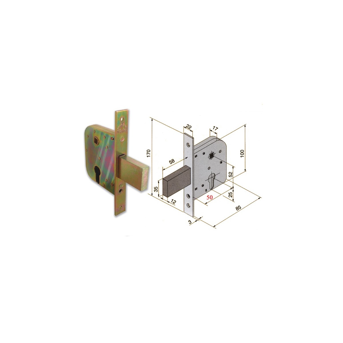Welka 070.50.00.0 Serratura per cancelletti, per cilindro europeo, 1 mandata con funzione di scrocco, quadro maniglia. Dimensioni: frontale mm.H170xL22, scatola mm.H100xL85xP17, entrata mm.50.