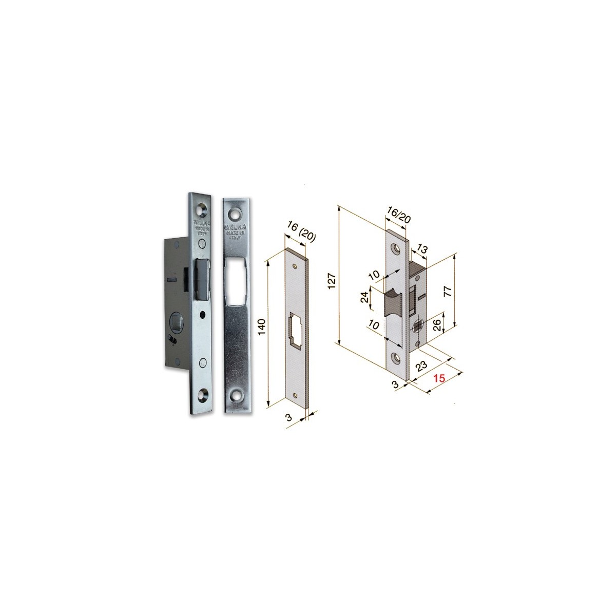 Welka 113.15.01.0 Serratura da infilare per montanti, scrocco, quadro maniglia. Dimensioni: frontale mm.H127xL16, scatola mm.H77xL23xP13, entrata mm.15.