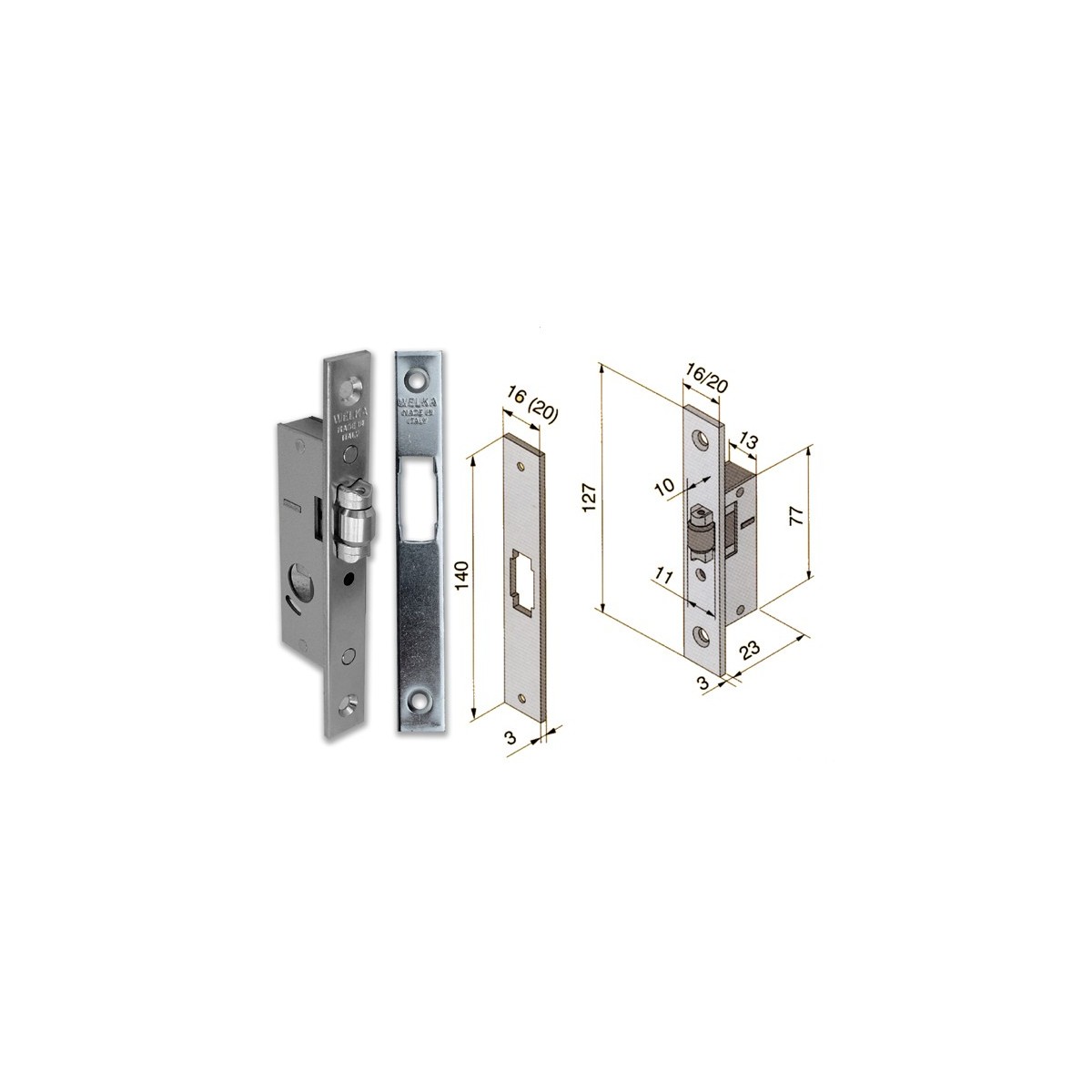 Welka 114.15.01.0 Serratura da infilare per montanti, scrocco a rullo. Dimensioni: frontale mm.H127xL16, scatola mm.H77xL23xP13, entrata mm.15.