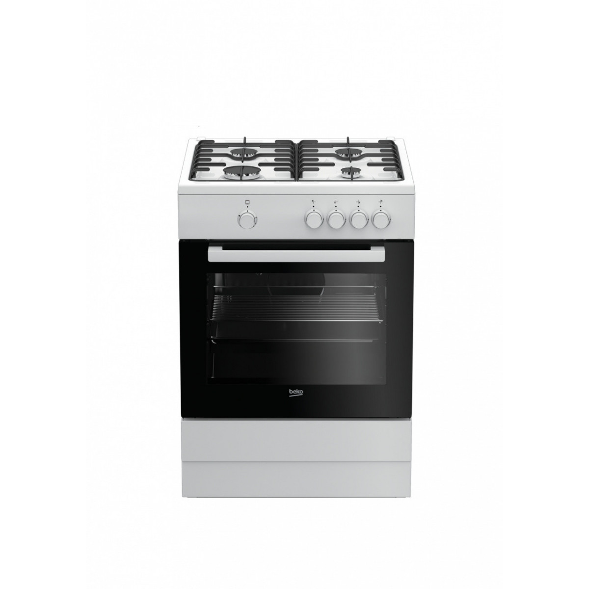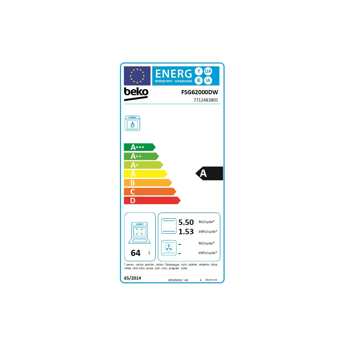 Beko FSG62000DW. Tipo di prodotto: Cucina, Colore del prodotto: Bianco, Tipo di controllo: Manopola. Tipo di piano cottura: Gas, Numero totale di fuochi: 4 Fornello(i), Numero di fuochi: 4 Fornello(i). Dimensione del forno: Media, Sorgente di alimentazione del forno: Gas, Capacità netta del forno: 64 L. Classe efficienza energetica: A, Consumo energetico (convenzionale): 1,53 kWh, Consumo energetico (convenzionale): 5,5 MJ. Larghezza: 600 mm, Profondità: 600 mm, Altezza: 850 mm